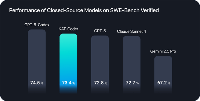 官方表示,在 SWE-bench Verified 榜单中,KAT-Coder-Pro 以 73.4% 的解决率跻身第一梯队,超越 GPT-5 与 Claude Sonnet。