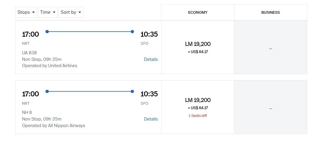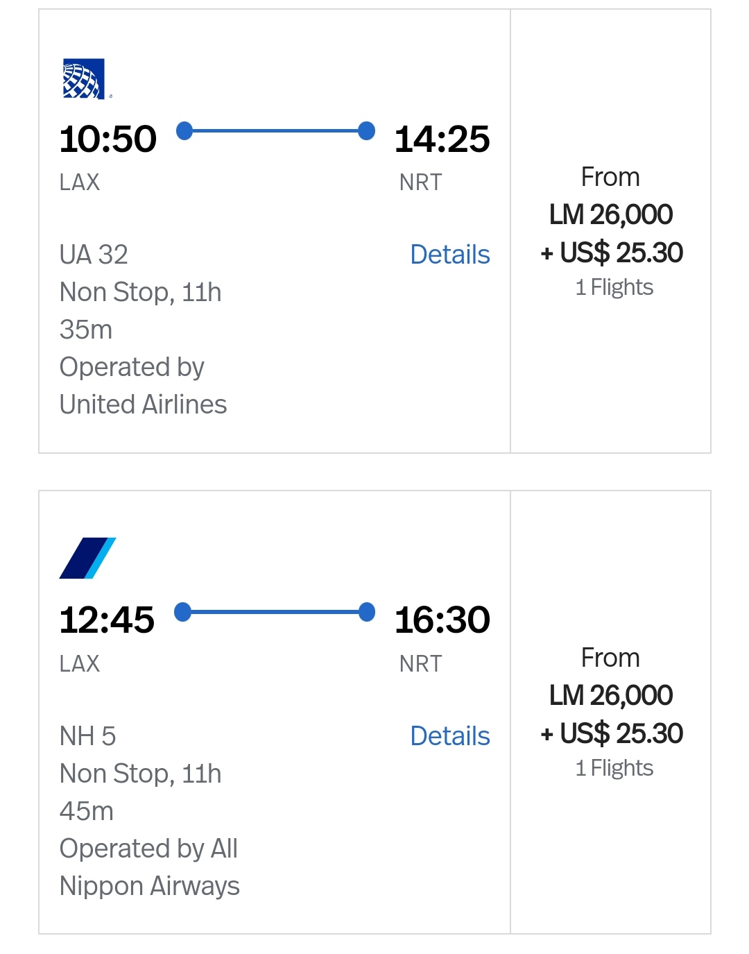 2.东京NRT-旧金山SFO 19.2k 或洛杉矶LAX-东京NRT 26k 经济舱
