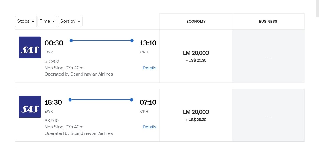 3.纽约JFK-苏黎世ZRH 16.5k和纽约EWR-哥本黑根CPH 20k 经济舱