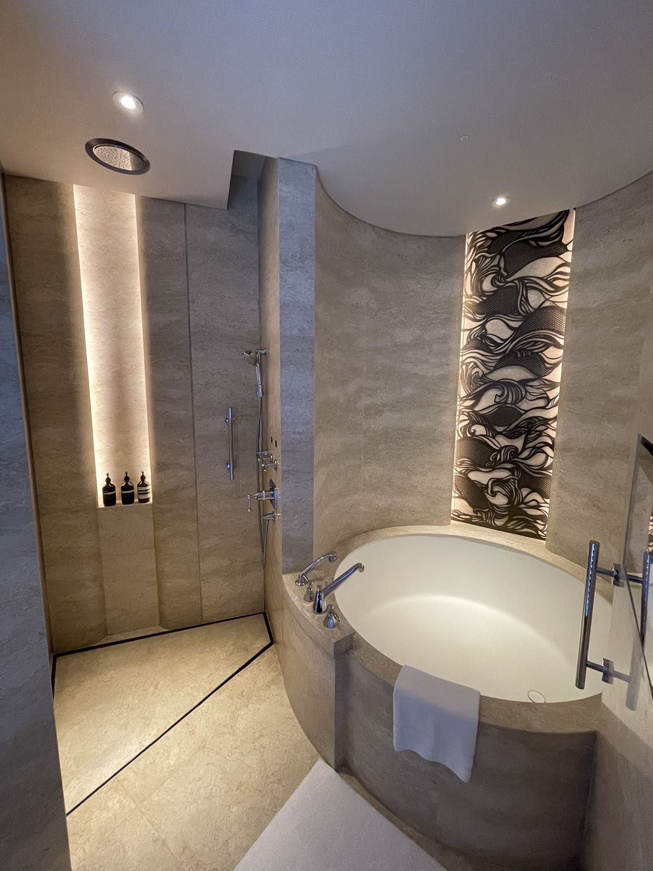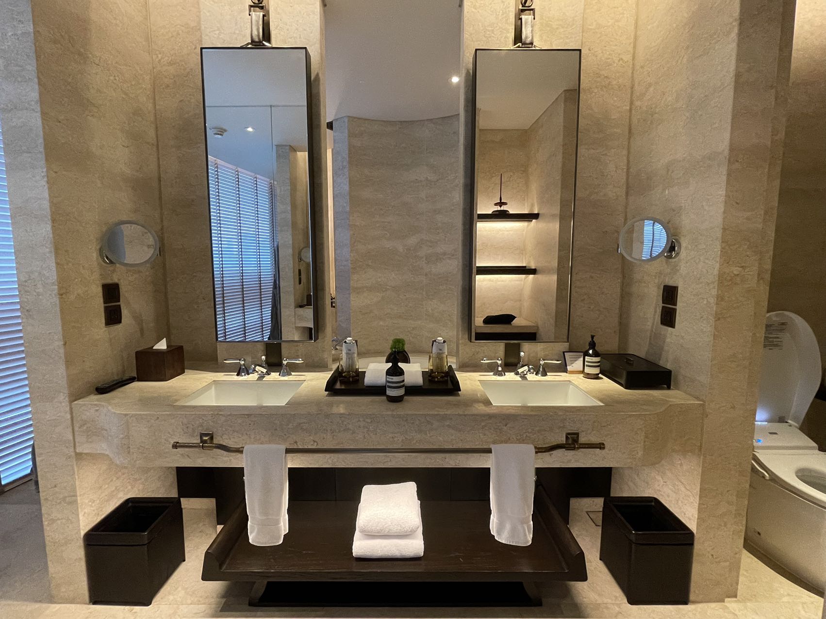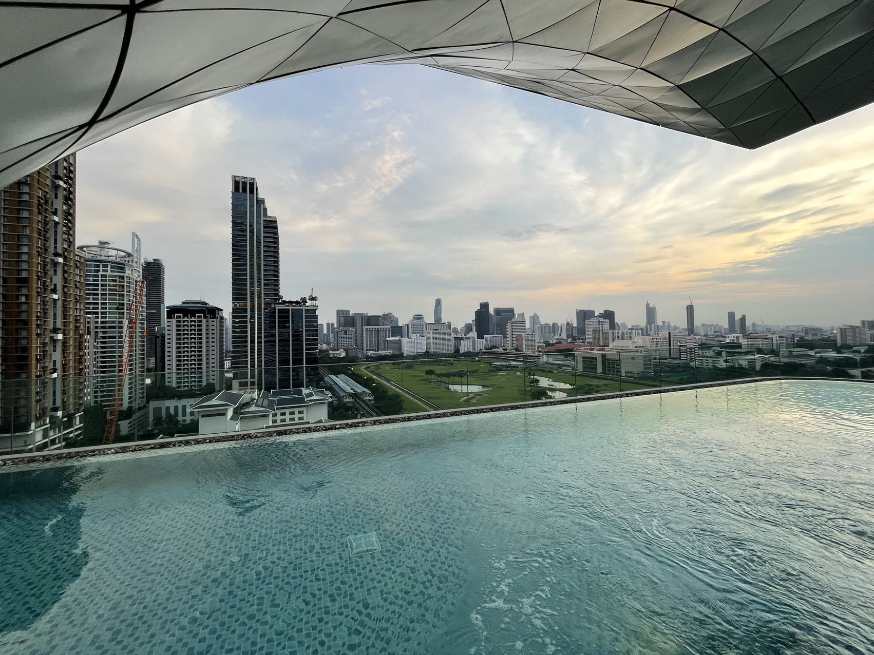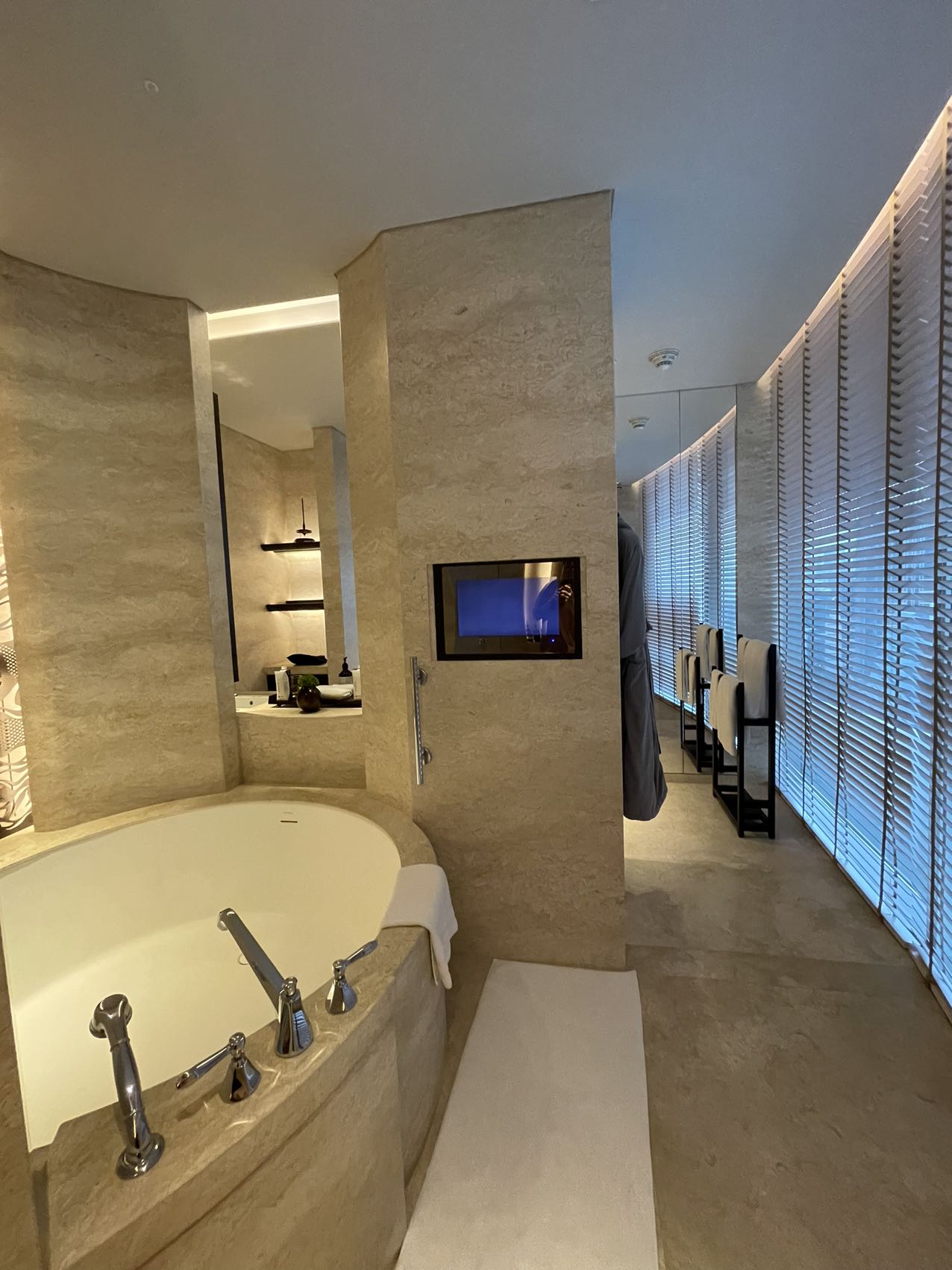 基础套面积还可以,华尔道夫的备品最近从菲拉格慕改成伊索大瓶装了。泳池在16层露台,俯视皇家体育俱乐部,视野不错。这家华尔道夫客房是从6层到15层,塔楼的中高层部分应该是公寓,附近有瑞吉、君悦、洲际、万丽和万怡。