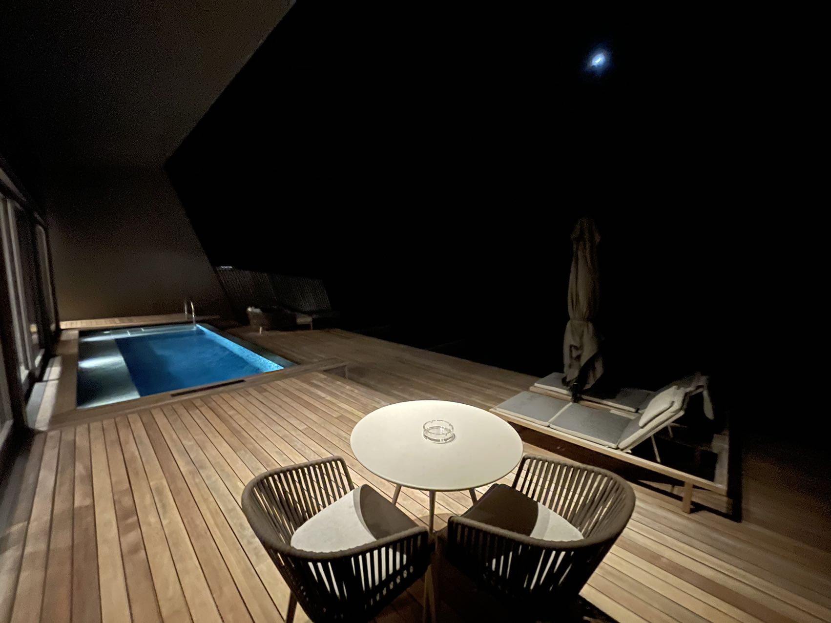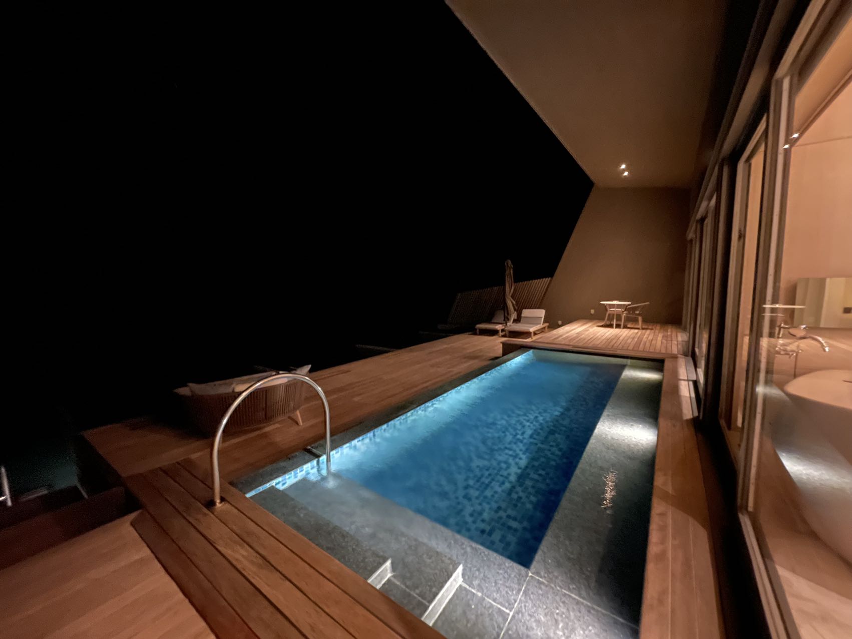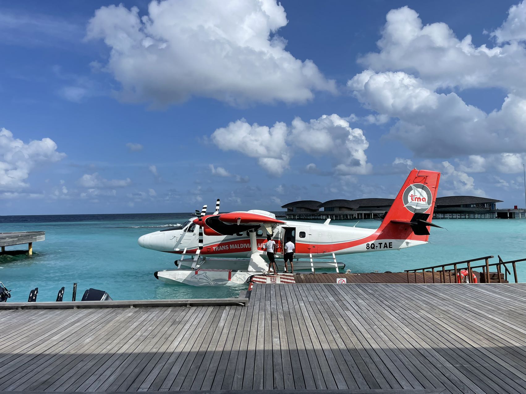 这里有一个插曲。在水飞lounge候机时,App上看到升级的日落水屋房号是544,我看了下酒店地图,是日落水屋那一条最靠近海岛的一间,甚至是对着酒店的Whale Bar。会哭的孩子有奶吃,果断通过App chat跟酒店抱怨,4在中国文化里非常不吉利啊,你这还俩4,前面还是个5。我心想,考验酒店应急的时候到了。在水飞起飞不久后,再查看App,已经改到533了,我对比了下酒店地图,是朝正西的那几间之一,十分满意。