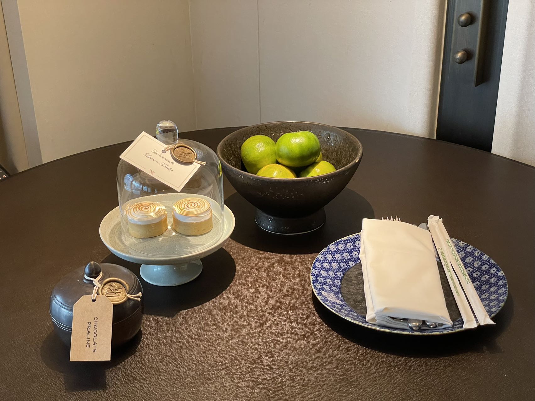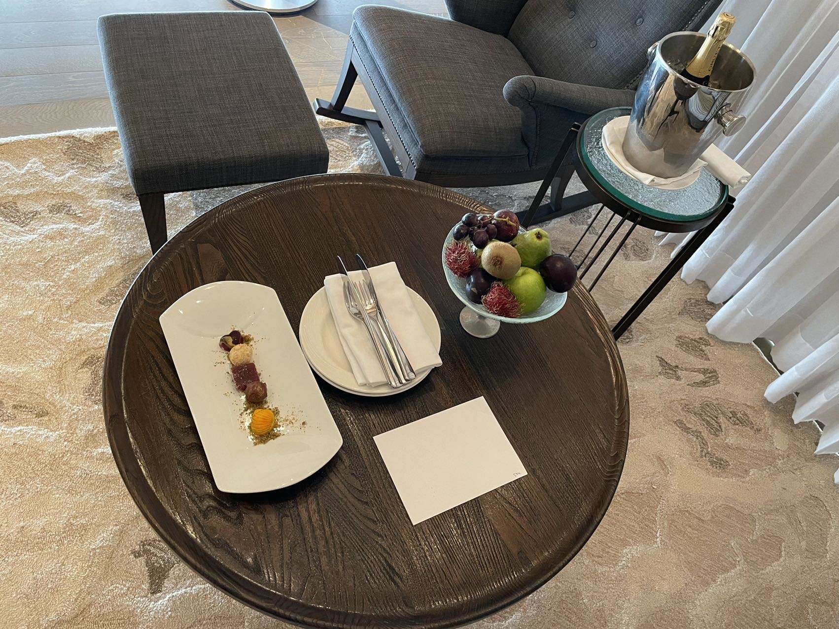因为orientale吃得很满意,我们把第三晚的in-room dining改成orientale。点了寿司和鳕鱼,鳕鱼强烈推荐,比我之前吃过的鳕鱼都好吃,后来我们又点了一盘松露寿司。餐厅送了我们两瓶风味果汁,免了我们第二盘松露寿司,还私下帮我们安排了上面提到的软壳蟹早餐。