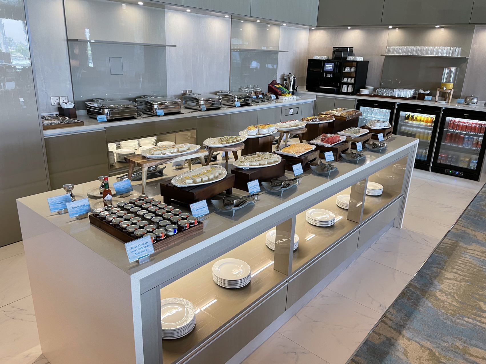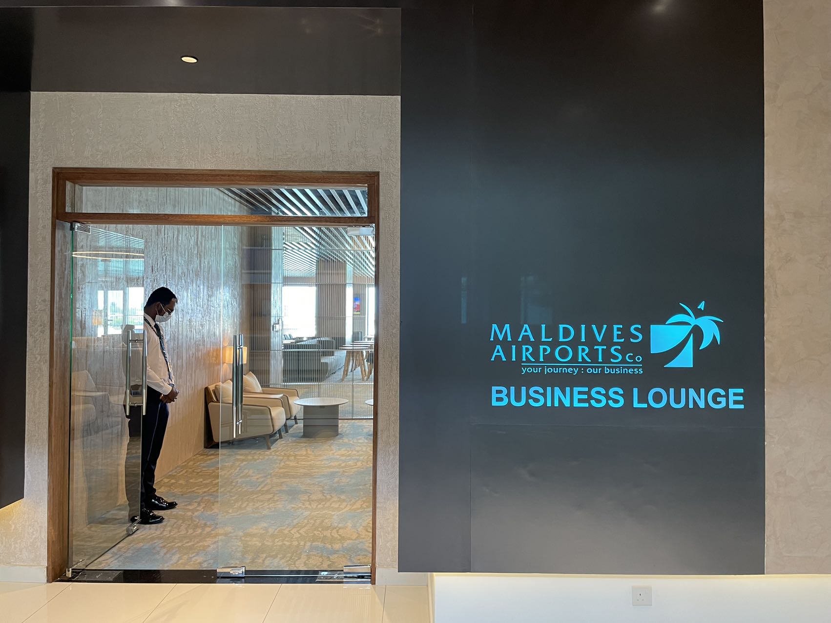 需要专门介绍一下,现在马代水飞修了新的航站楼非常气派,老的航站楼已经被推平了。新航站楼一楼是大厅和登机口,二楼是公共的休息厅和商务休息厅,三楼四楼是各大牌酒店的私人休息厅。由于三楼四楼还在装修,瑞吉临时租用了二楼的商务休息厅。