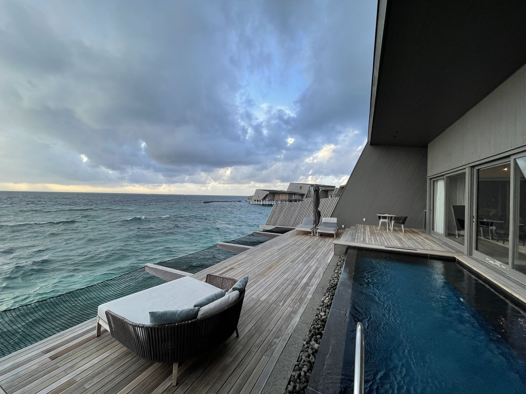 水屋和沙屋的对比:瑞吉的两种房型价格其实基本一致,水屋比较新鲜,甲板能直接下海浮潜,沙屋比较方便,甲板能直接到沙滩躺着以及从沙滩下海。我对沙滩更感兴趣,而且风浪小很多。第一次来马代有机会当然是体验水屋,以后再来的话,我更想去住沙屋。
