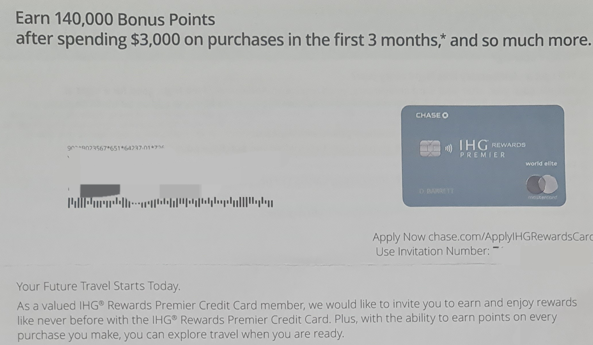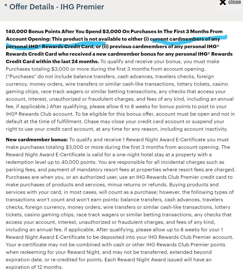 有老的49年费的卡,之前一直发信让升级没升。今天收到chase纸质邀请,pre-select IHG Rewards Premium Credit card。花3000给140k点,但没有free night。 信里还有邀请码,这个可以突破有老卡不能申请新卡的规定吗?谢谢!