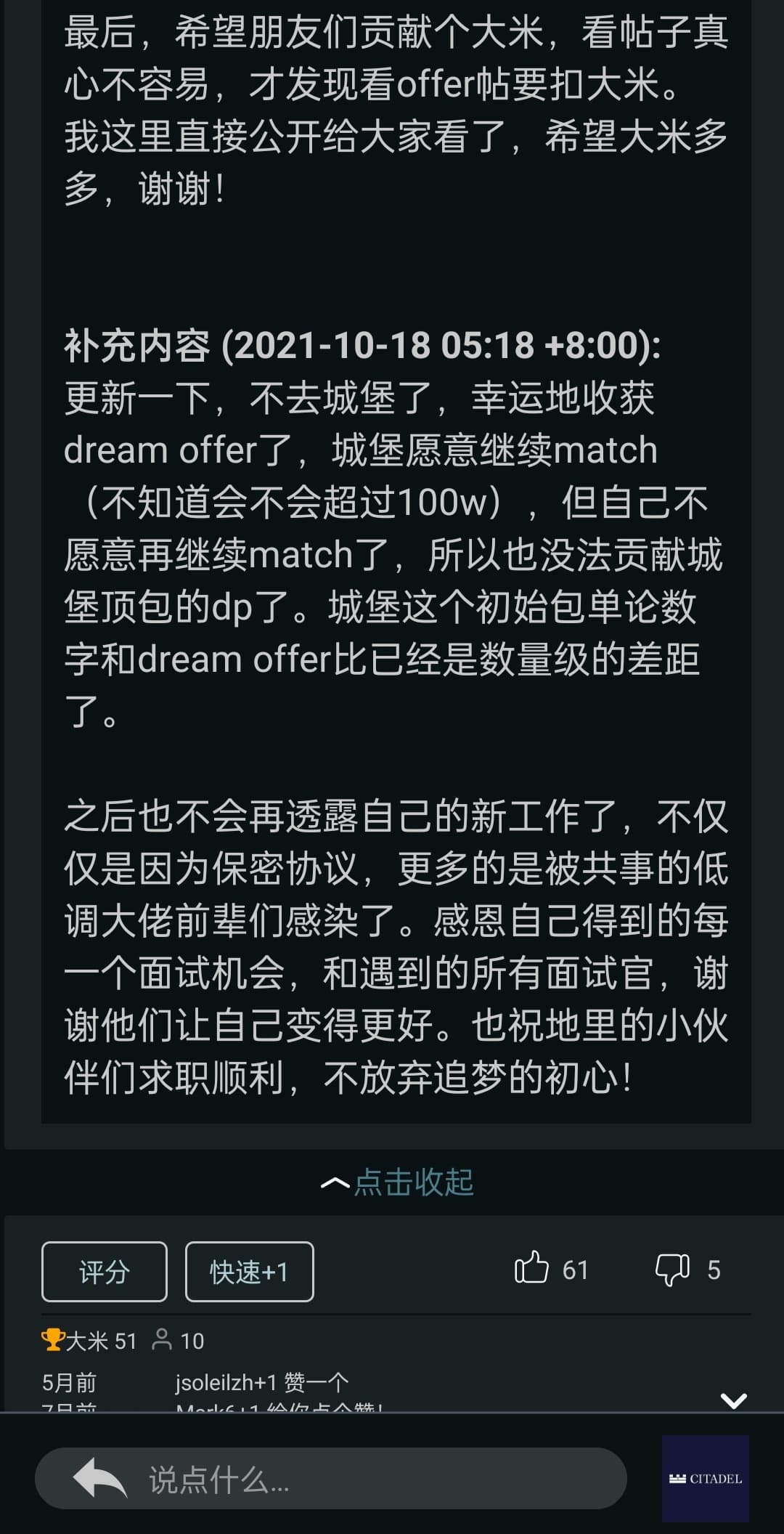 我之前可能理解错了。其实是citadel说愿意match,但其实是在没见到具体数字的情况下,所以po主才说“不知道会不会超过100w”。