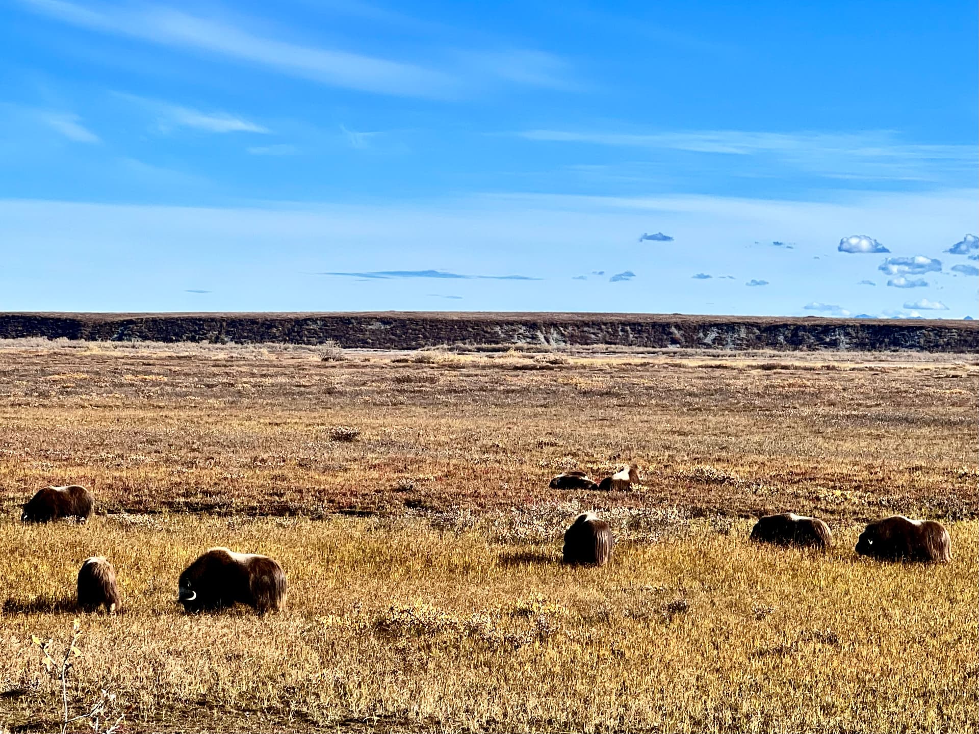 继续开呀开过了Atigun Pass就是北极大苔原了。来了了这里就一棵树都没有啦,路边的风景变成了灌木加湿地。这时候视野是真是非常的开阔,远处一直看到地平线的尽头无遮无挡。
