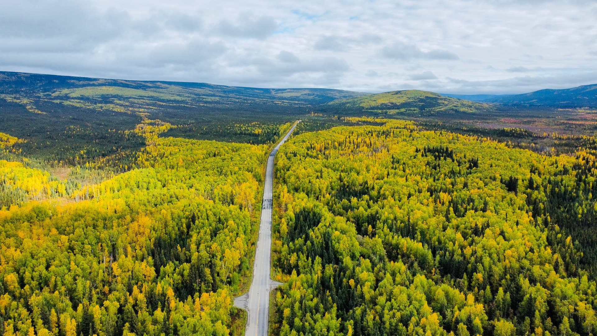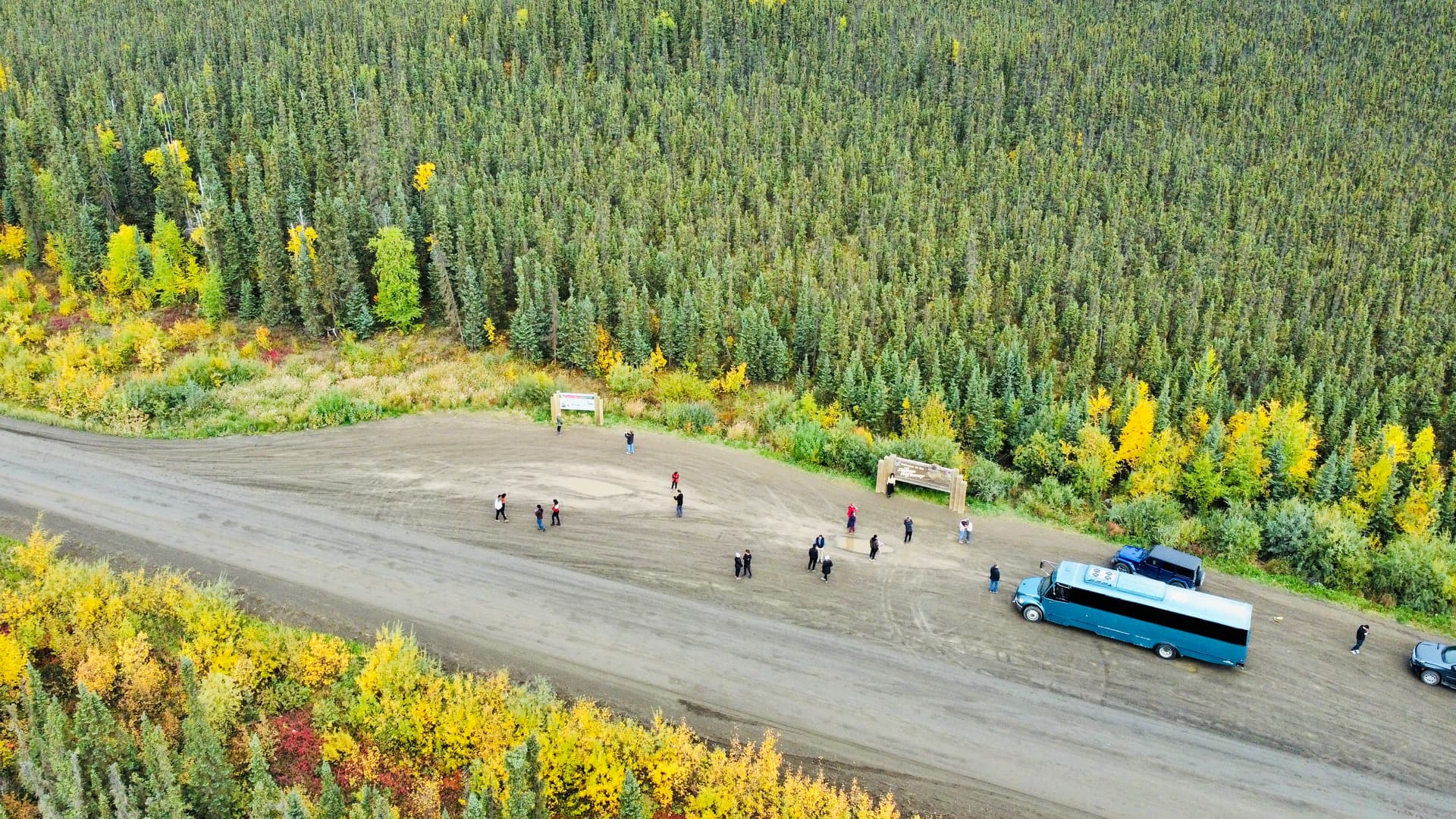 回酒店睡醒一早就出发前往ColdFoot了。Labor Day的秋色赏心悦目,满山黄绿相间的树林。路上可以随便飞无人机拍照,非常的舒心。