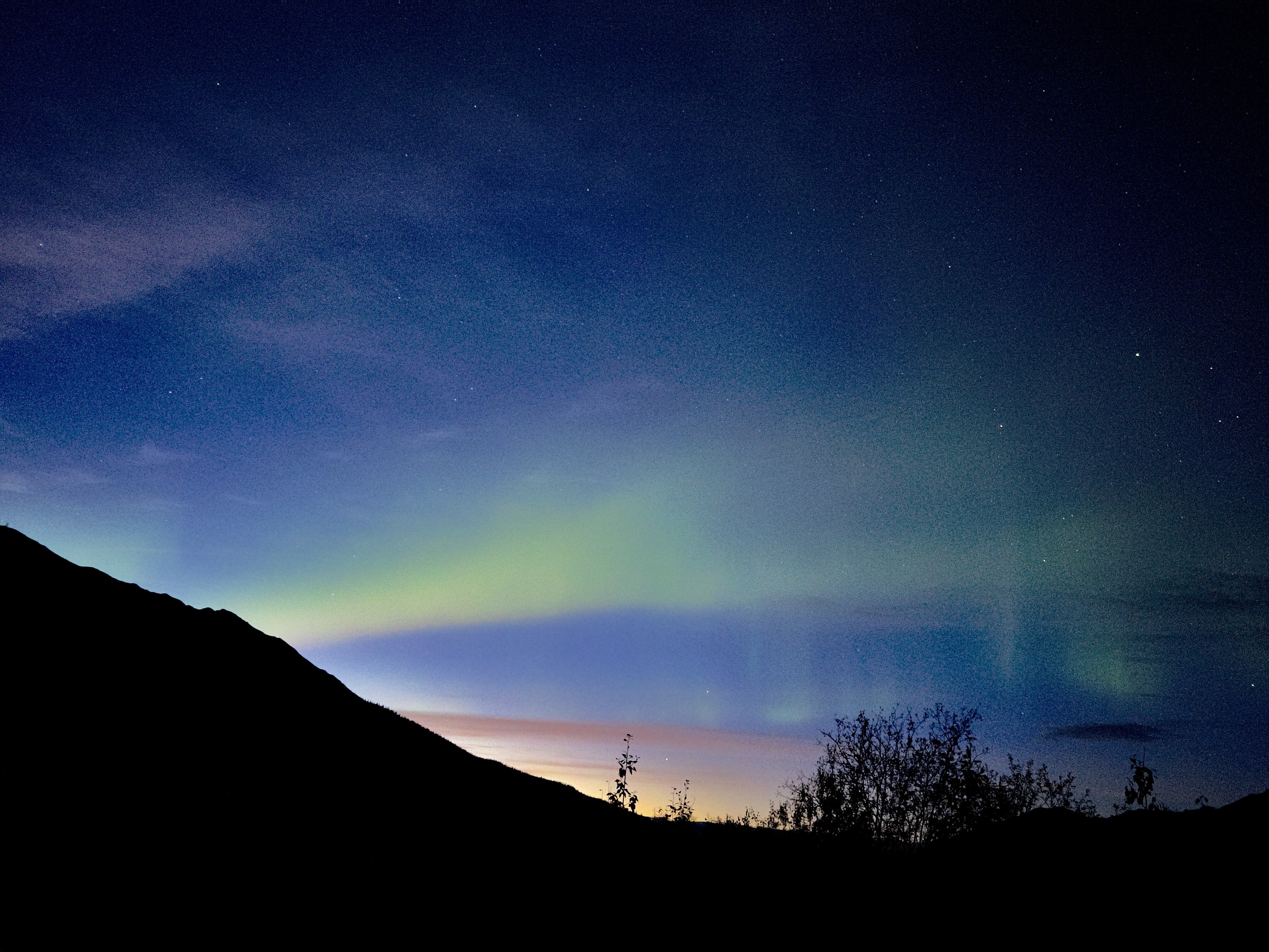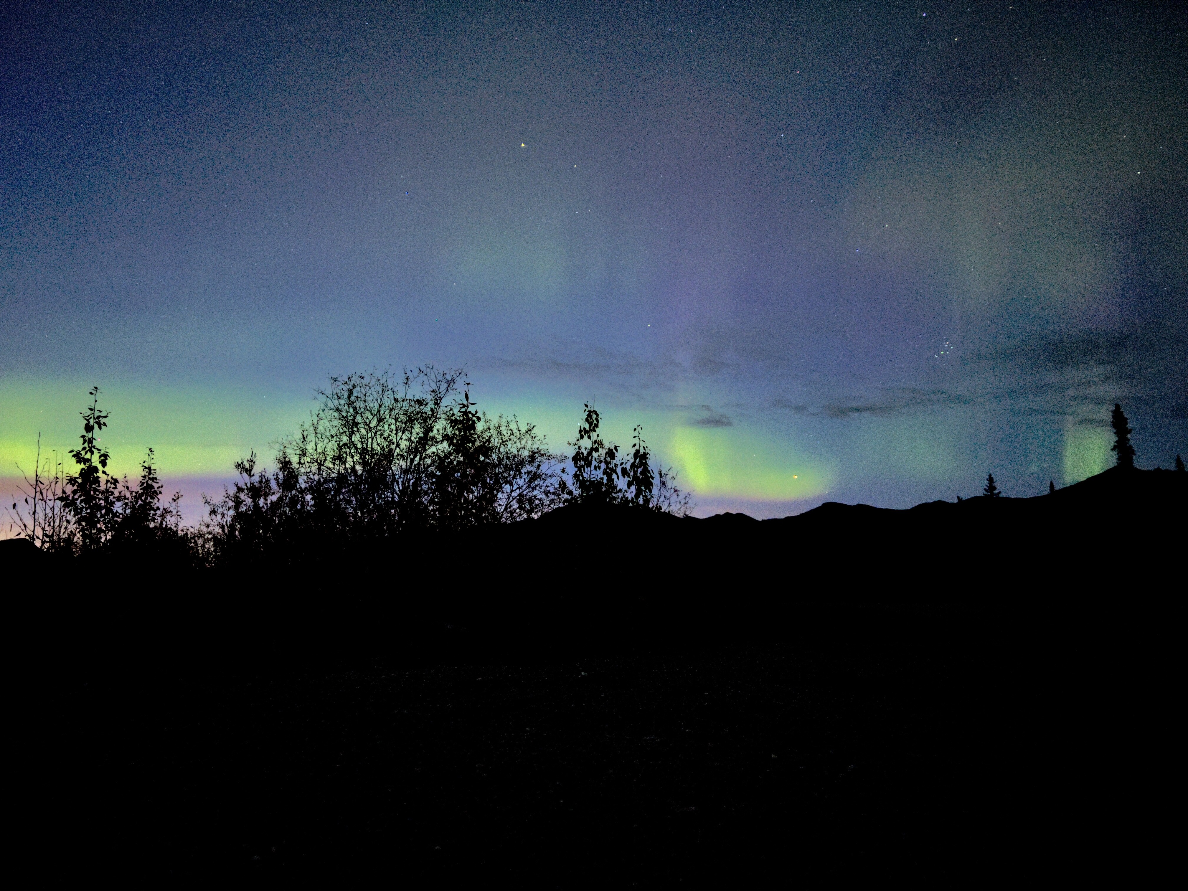 在Fairbanks住的这天KP Index是6,极光小爆发。凌晨1点爬起来抵达Cleary Summit已是人山人海。非常不幸的是因为阴天的缘故,极光肉眼看上去就是一片灰白色的亮光,很难和云彩区分开。但是神奇的事情出现了,只要用iPhone 13 pro在架子上随便拍一张10s的夜景照片,然后点击Edit → Auto,iOS就能自动P出满天绿色的极光。这个效果嘛,发朋友圈足够了。这个原理嘛,我猜是AI P图。