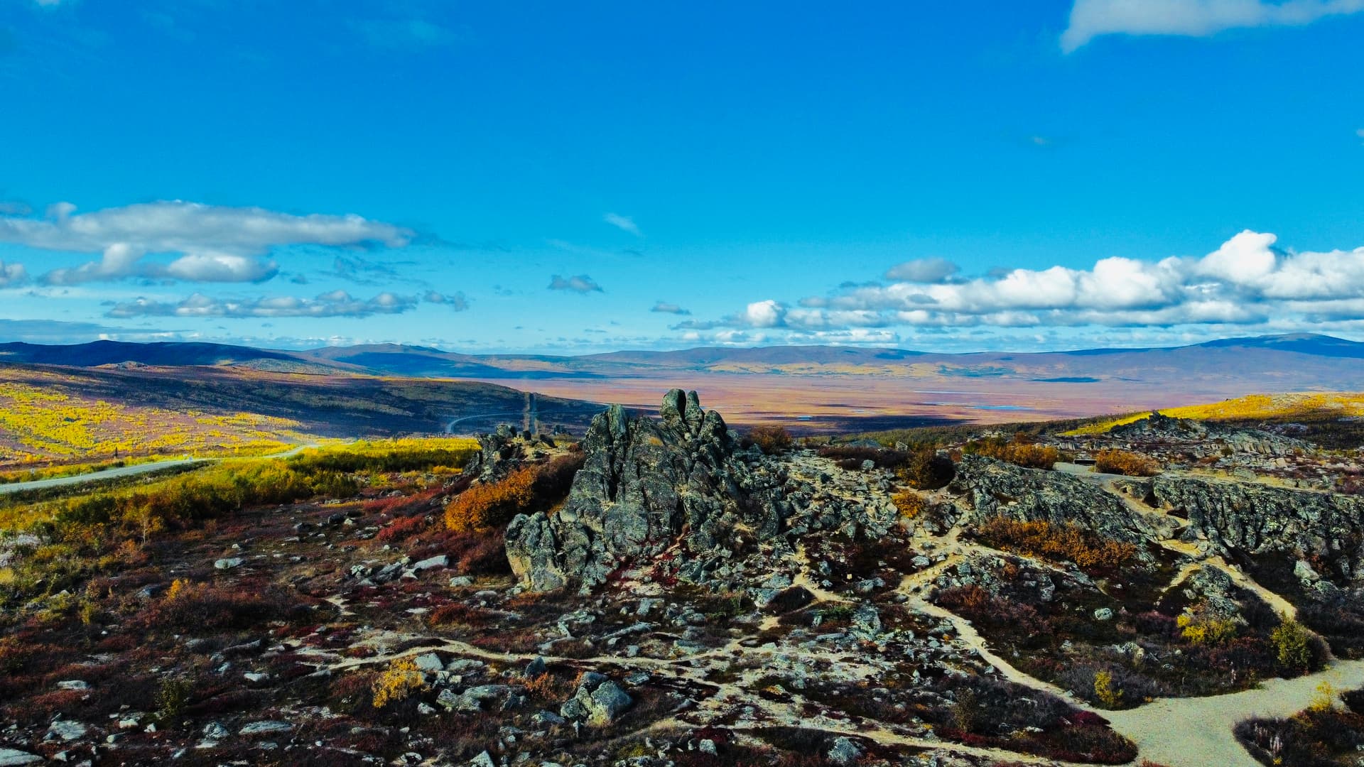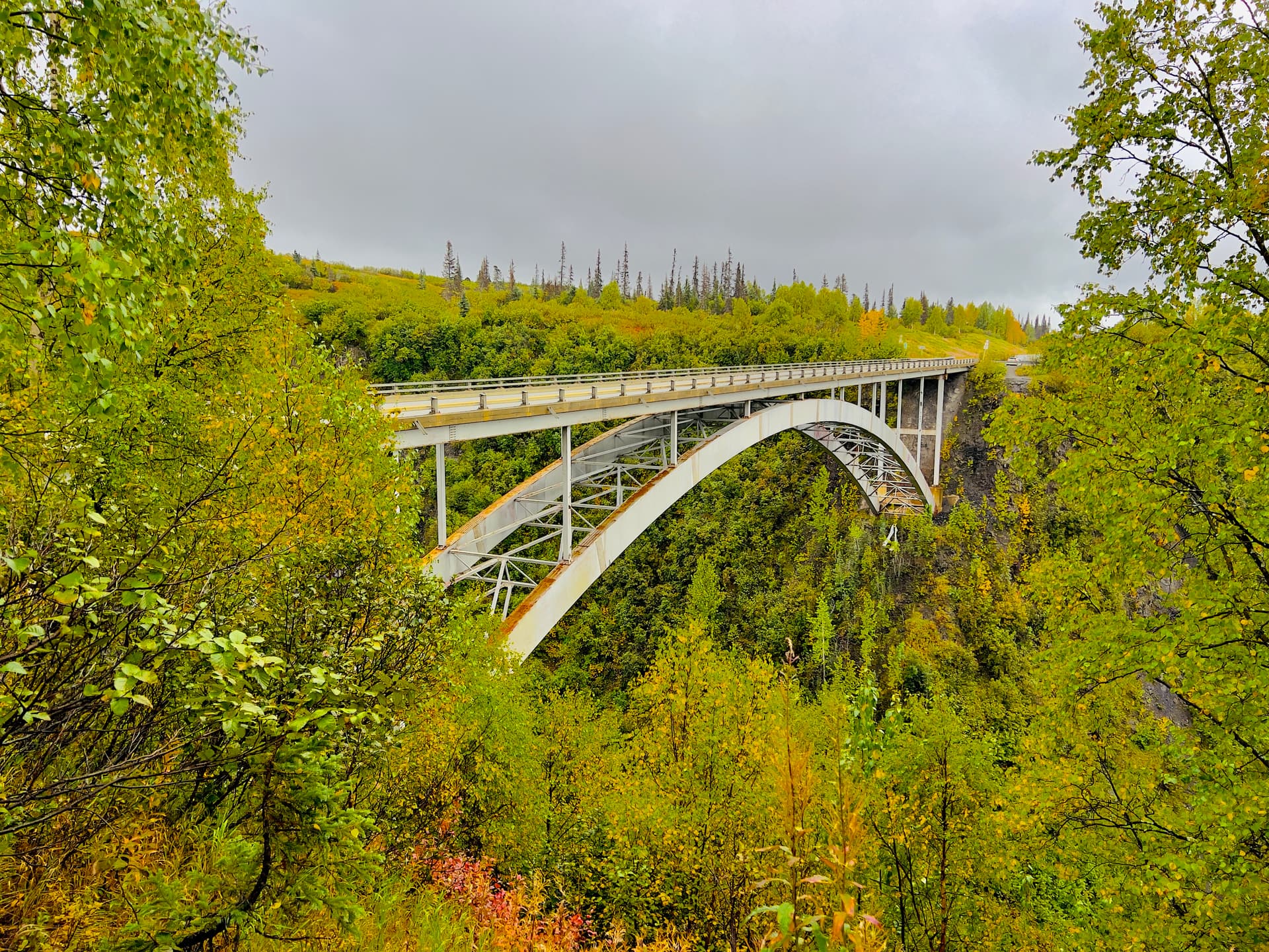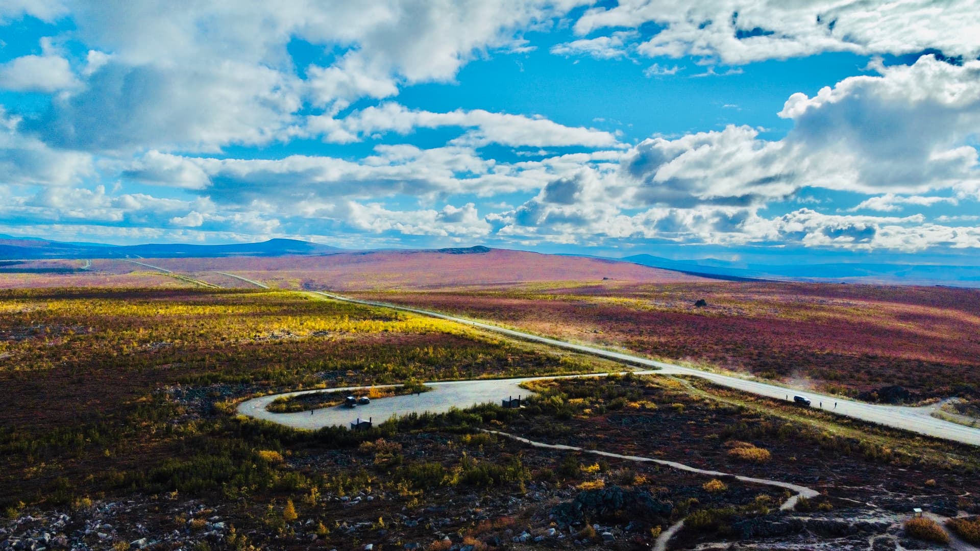 吃完饭之后继续开开开,2个小时左右就能到北极圈了。这时会开始感觉树变稀少的同时灌木变得多了,路边的风景也会出现一些深红色。另外非常反直觉的,路况变好了不少,铺装路面的比例甚至比非铺装路面还要大。