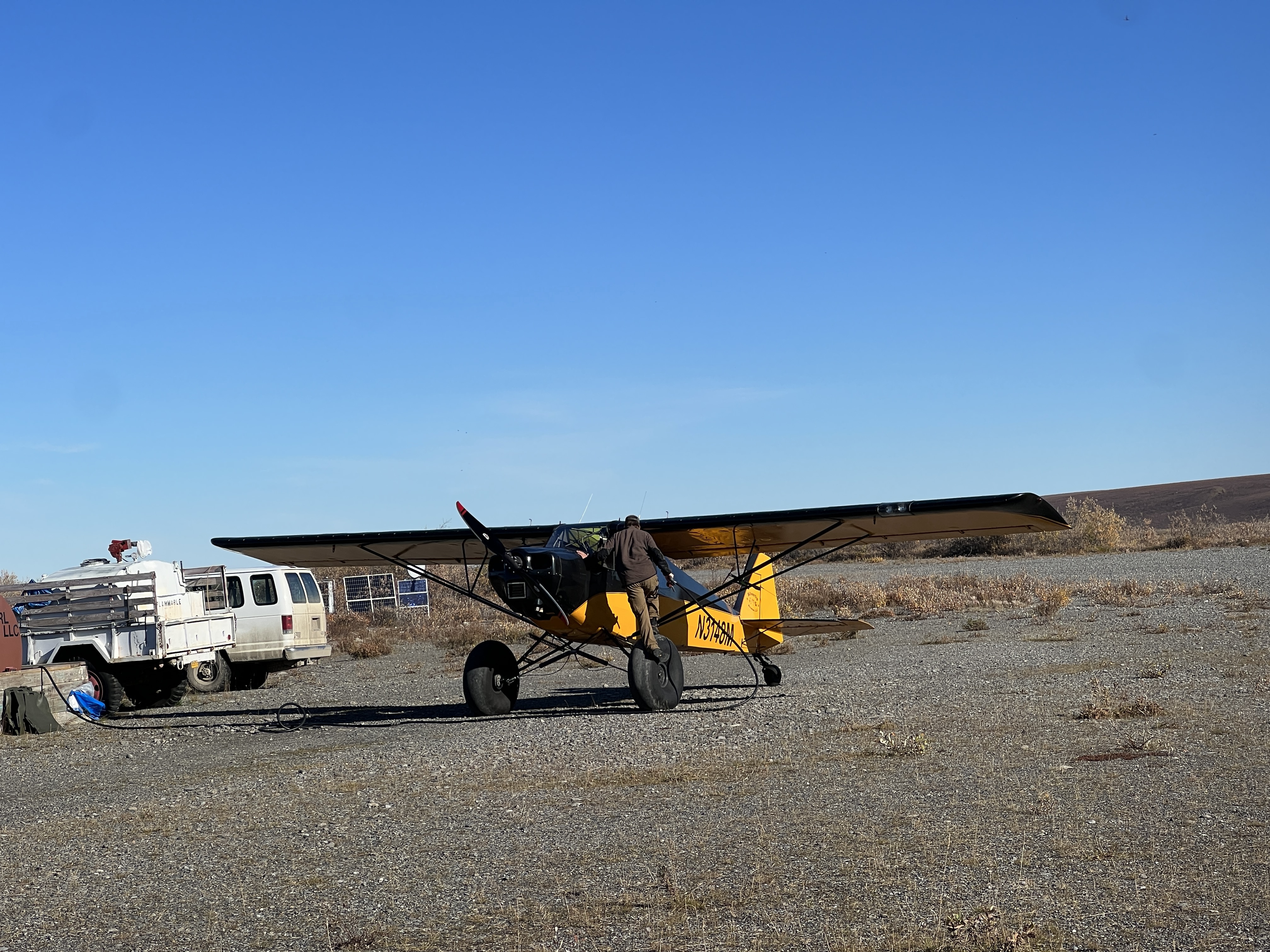 这位开飞机的老哥,在我们路边停车休息的时候俯冲下来降落,滑行到我们前面20米的时候才停稳。一度我在想会不会就这么撞上了,我要不要弃车逃命。。然后大哥带着狗,加了一下油还是水的,加速起飞又走了。我第一次见识到了这种完全不需要机场,说走就走的小飞机