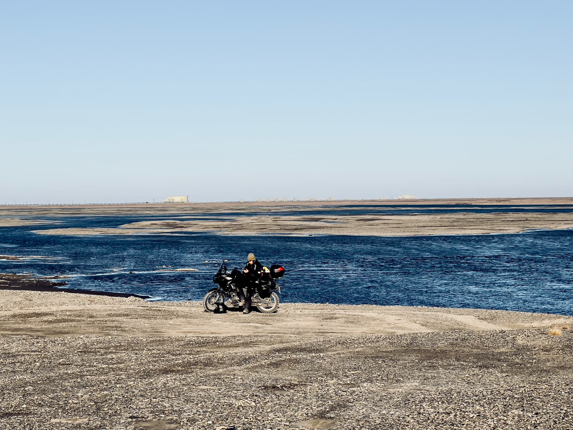 下面这位在我们第一天经过的时候,就一个人在摩托上一动不动的坐着。傍晚我们出来拍夕阳的时候,他在同样的位置搭了帐篷,依然一动不动坐在车上。第二天上午往回开的时候,看见他帐篷边只有摩托车停在一旁,人应该还在休息。不知道他经历了什么开始这自己的旅行,也不知道他要在这里停留多久结束旅行。
