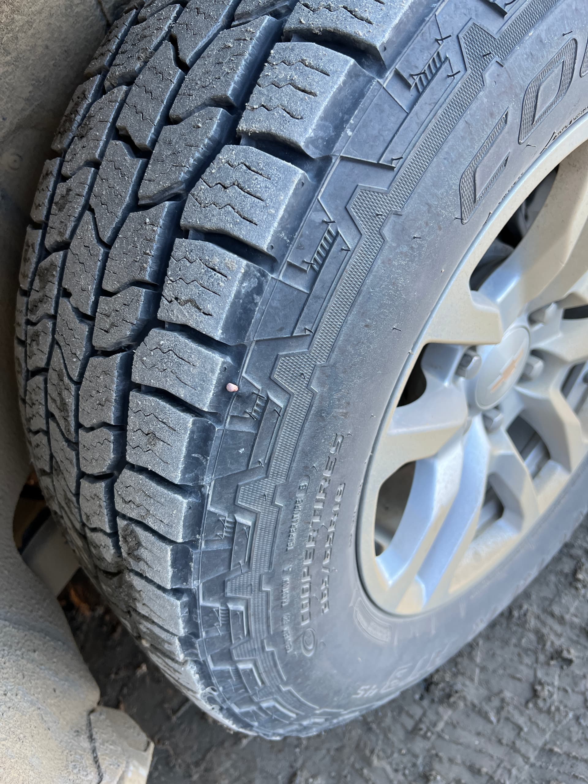 师傅拔出来一颗七八厘米的钉子后用橡胶条折腾了10来分钟也没有补好,直接宣告了轮胎报废。它帮换了备胎收了40刀,到这时候这个钉子已经花了我们165刀。说起来Surbuban的备胎时下卦备胎,我们之前谁也没搞过。租来的车也不带书名书,加上路上也没网,我估计我们几个人琢磨一天也拆不下来它。