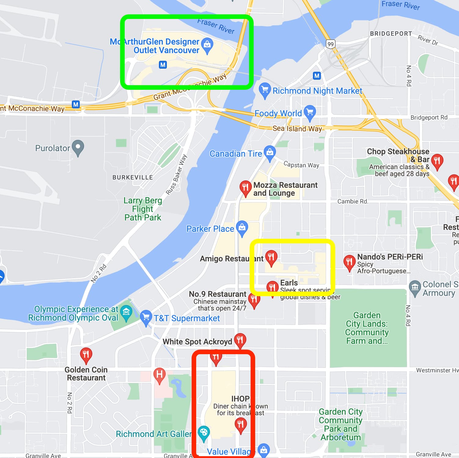 绿色就是那个outlets,你在附近找个离城铁站近的住的话,去哪里都方便了,买个compass卡,买day pass,出门很方便,温哥华列治文可以不开车的