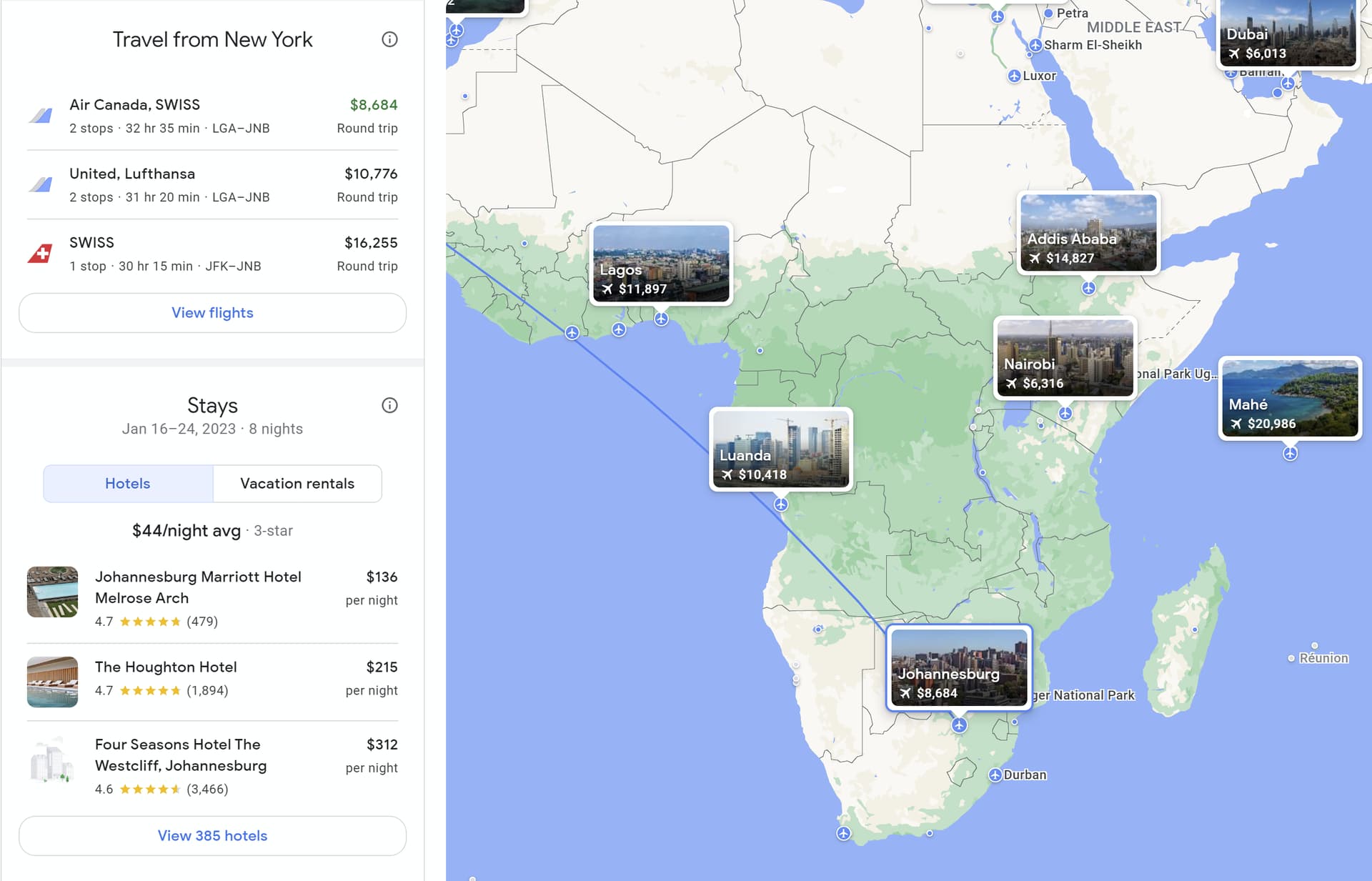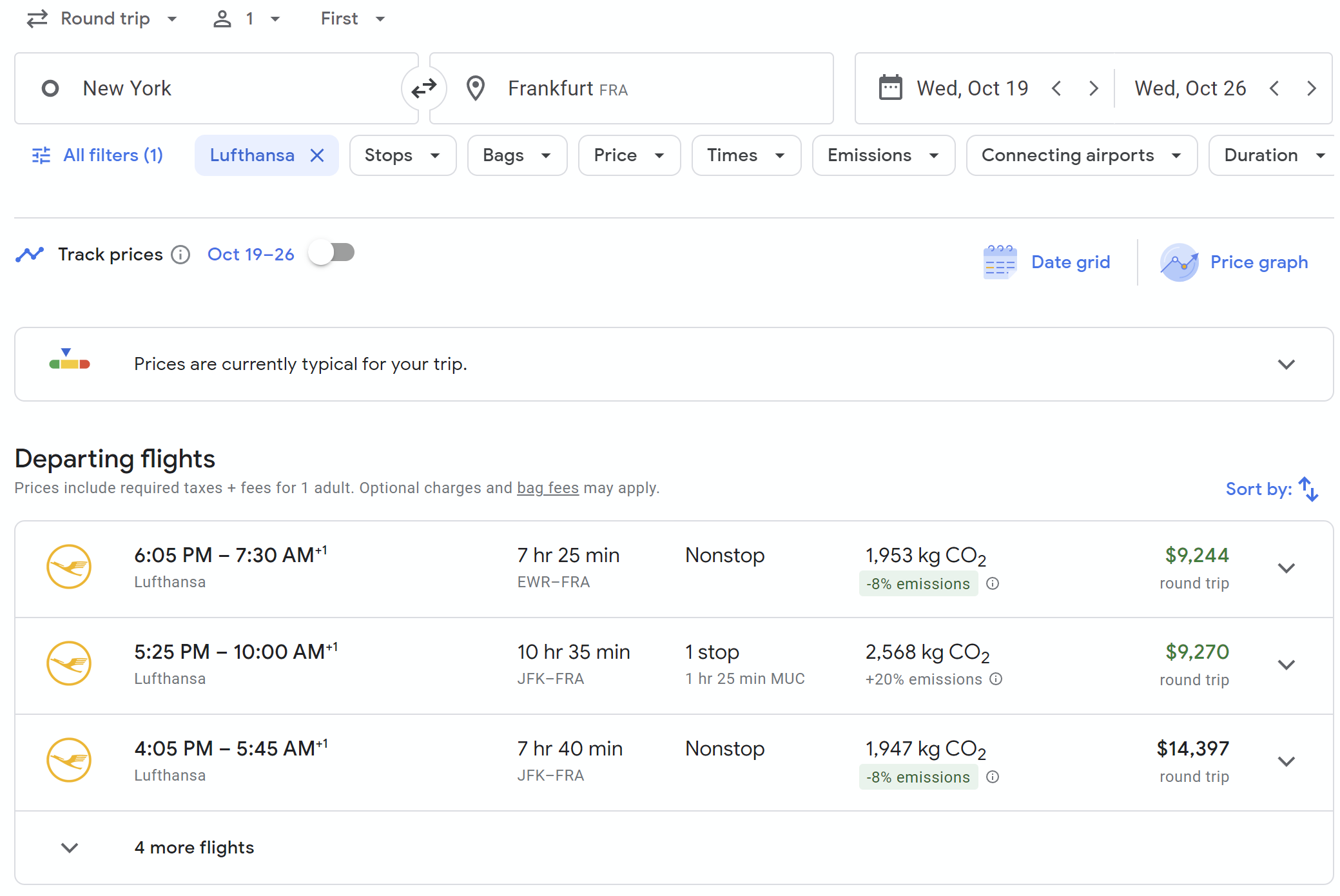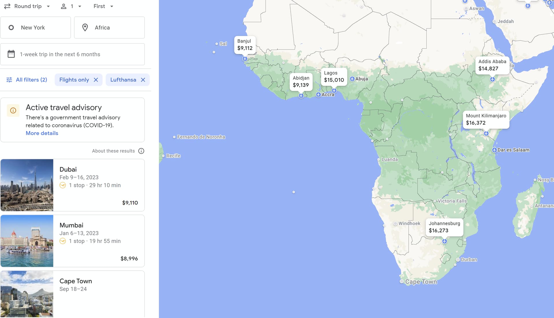 这时你可以先随便做个LH头等能到的行程(比如NYC-FRA),时间不限,然后再把FRA替换成区域性的名词(比如Africa)