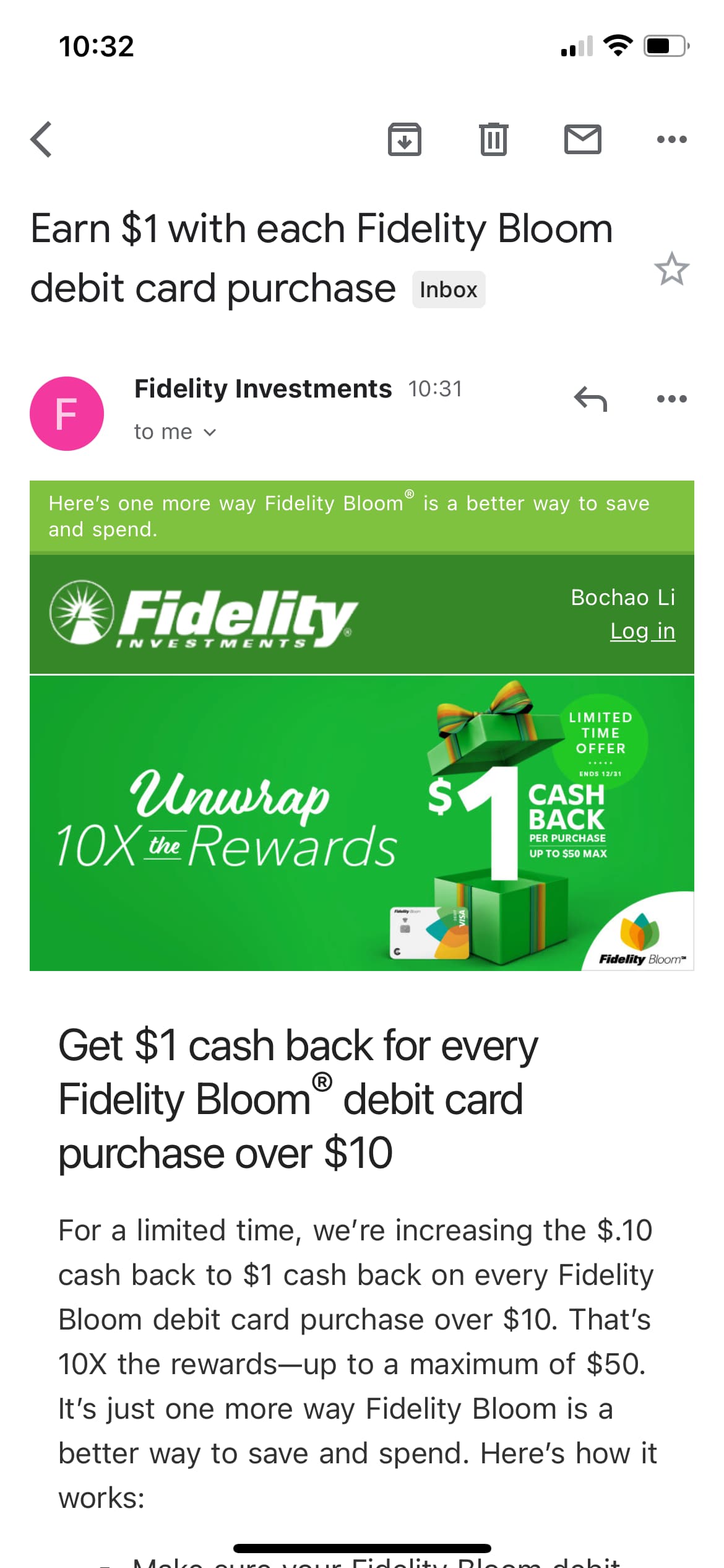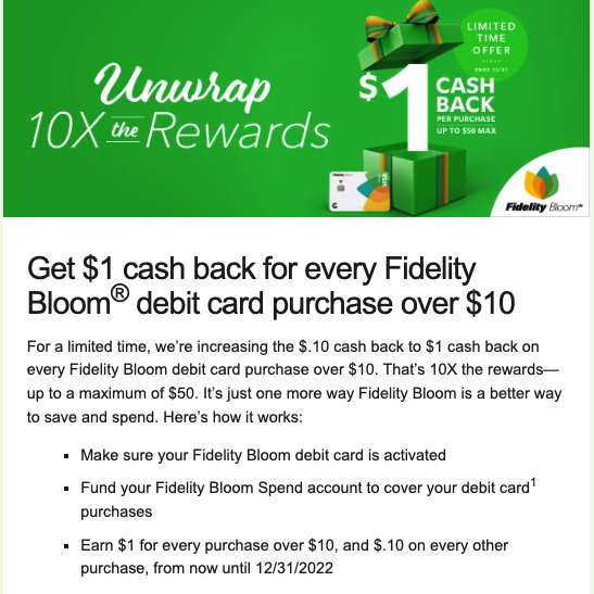 Get $1 cash back for every Fidelity Bloom® debit card purchase over $10