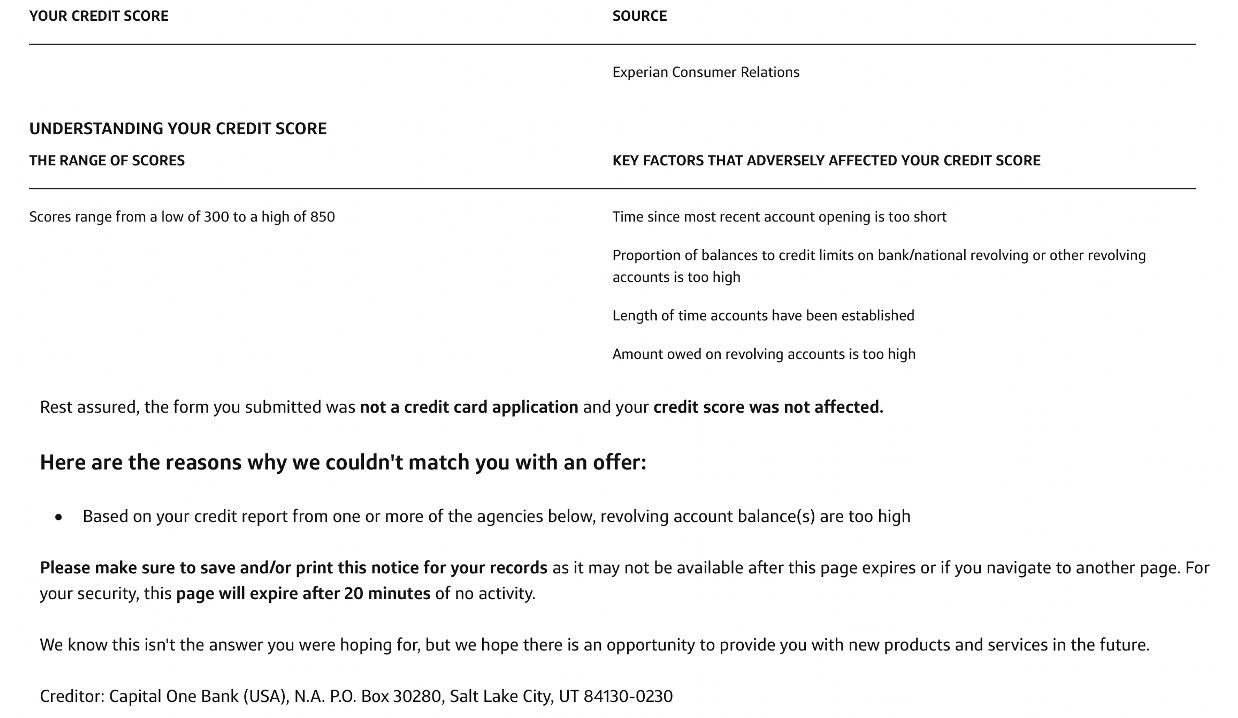 更新一个可能有用的测试,如果开一张新卡,故意刷高utilization,不是全部卡的utilization,只是某一两张卡的utilization。等上报了信用局,立刻C1 prequalify一下,马上reject,然后显示了详细的原因。如果想申请Venture X可以看下这个深度测试,用这种方法看看C1在关注lz的什么条件(不建议申请前测试,不建议新手这么玩)。