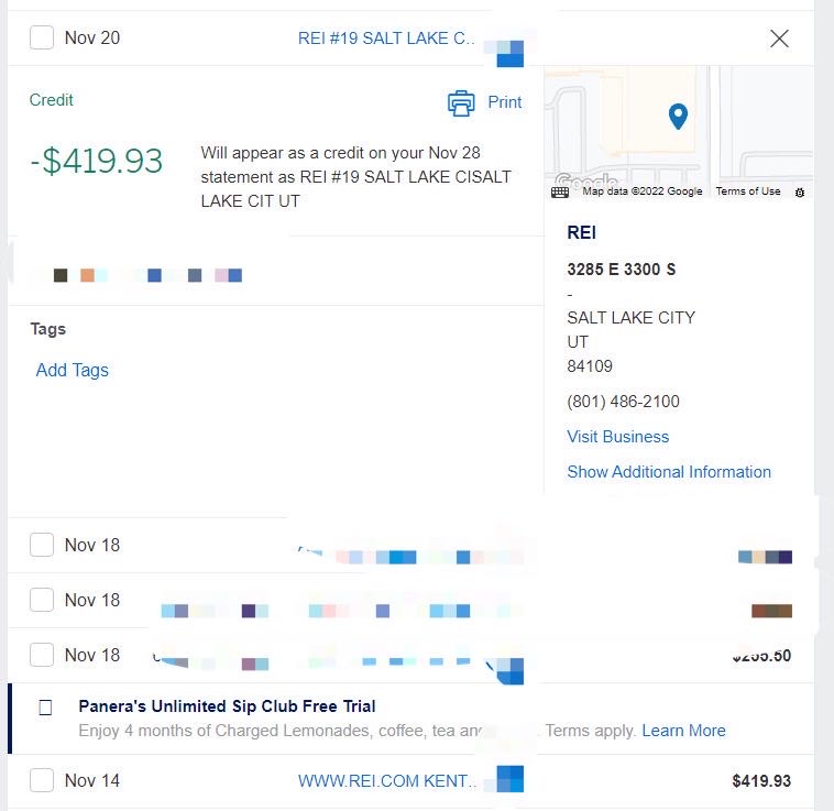 如下图,在网上买了一个东西,charge的是REI.COM, 退货是走的线下门店退货,直接从local store credit到的这张信用卡(REI #19 SALT LAKE CITY)。那这一笔能累计开卡消费吗?消费和退款的不是同一家。