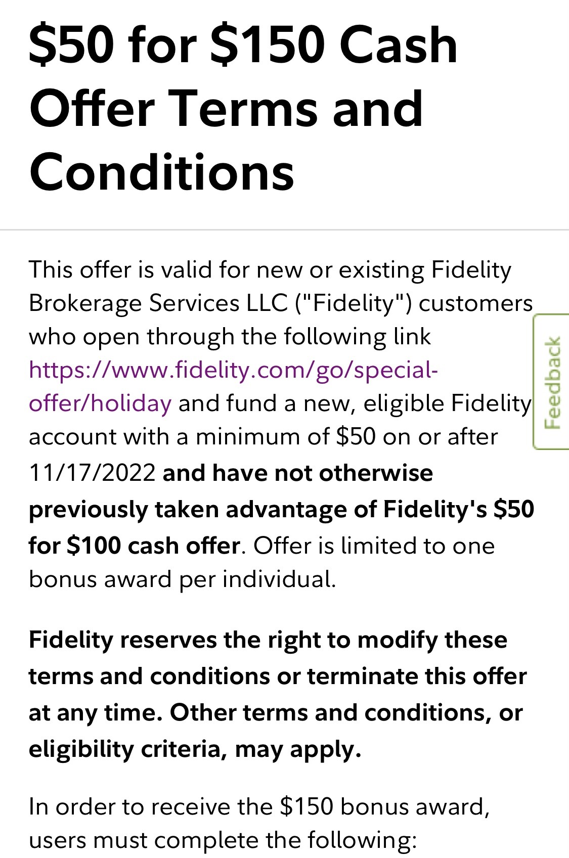 This offer is valid for new or existing Fidelity Brokerage Services LLC (“Fidelity”) customers who open through the following link Special offers | Fidelity and fund a new, eligible Fidelity account with a minimum of $50 on or after 11/17/2022 and have not otherwise previously taken advantage of Fidelity’s $50 for $100 cash offer. Offer is limited to one bonus award per individual.