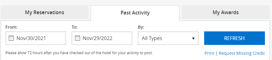 正确姿势是登陆后 进入电脑端Hyatt账户past activity页面 往下搜Chase Credit Card Night Credits。
