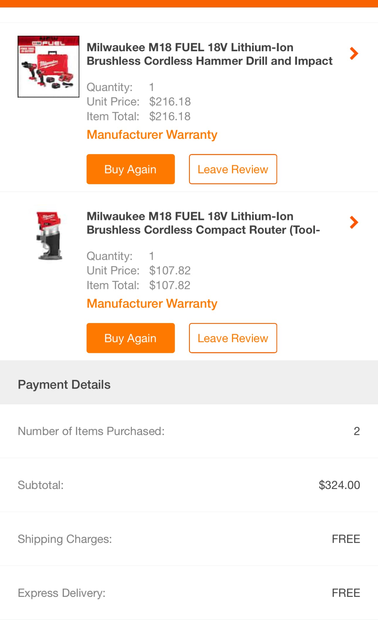 我下完单后让客服取消赠品,结果客服把我整个订单取消了,他主动提出给我75 OFF,所以最后我算下来就$216+税入了这套Milwaukee M18 FUEL Hammer Drill + Impact Driver再带两个电池和充电器 ![]()
