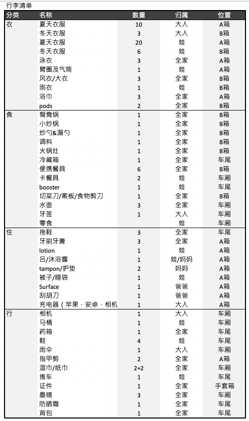 我们准备了两个大29寸行李箱,出发前大概已经装满了一个半,另外还有一个大Cooler(可以用来装饮料以及一些火锅食材),及便携式的炉灶、锅跟餐具,基本上第三排空间是用满的。详细清单如下: