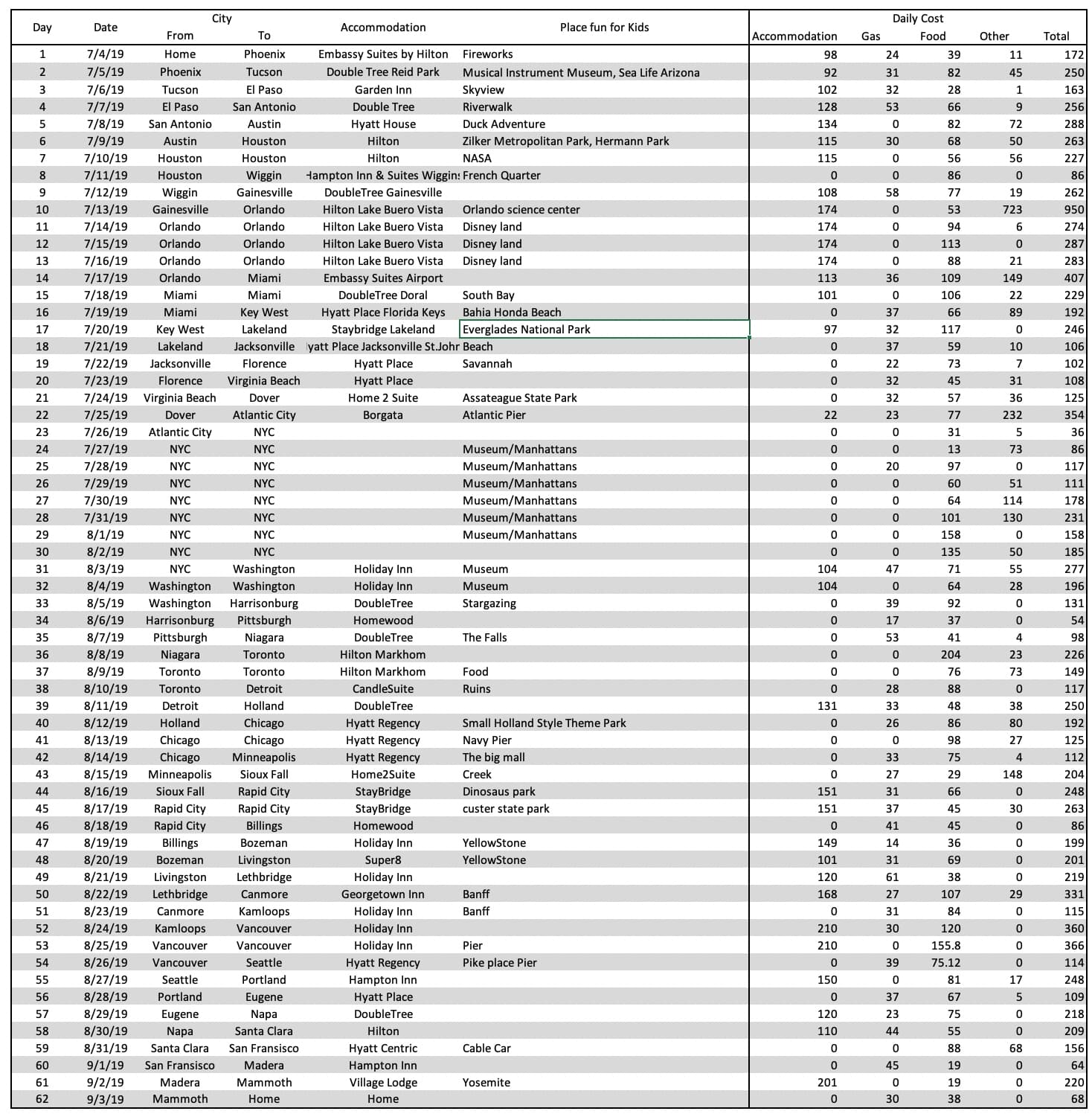 实际出发时间:7/4/19 - 9/3/19,62天,12,668 Miles。 平均路程一天200Mile左右,最多的一天路上大概走了8个小时,500 Miles左右。