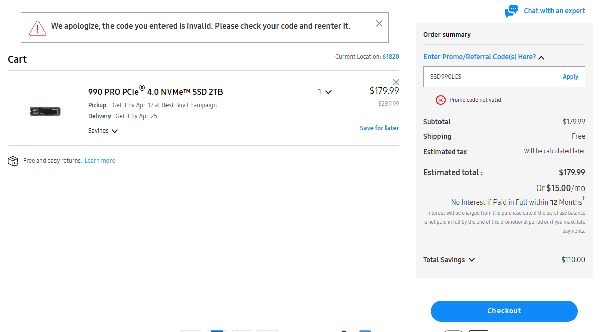 三星官网 990pro 2t 143.99刀需要promo SSD990LCS,不能使用EPP之类的账号
