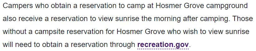 补充一下,公园内的Hosmer Grove Campground的预约自带sunrise预约,刚成功刷了2晚