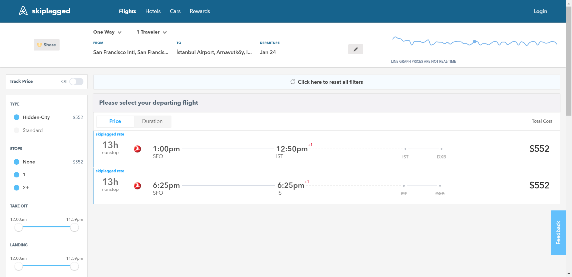 如图,搜索完成后,点击左侧hidden city 标签,即可找到甩尾票