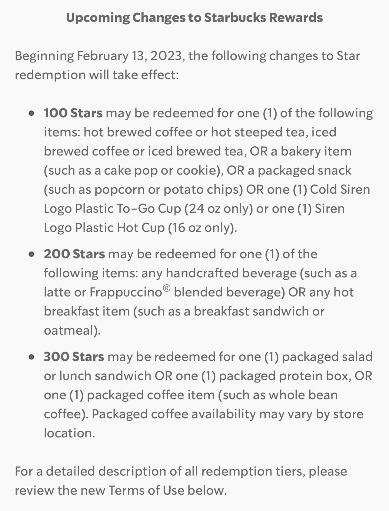 仔细瞅了一眼,400星还是可以换up to $20的merch的,咖啡原来好像也要400才能换?现在300了反而降了,但是现阶段最值的换bakery变成100就emmmm了