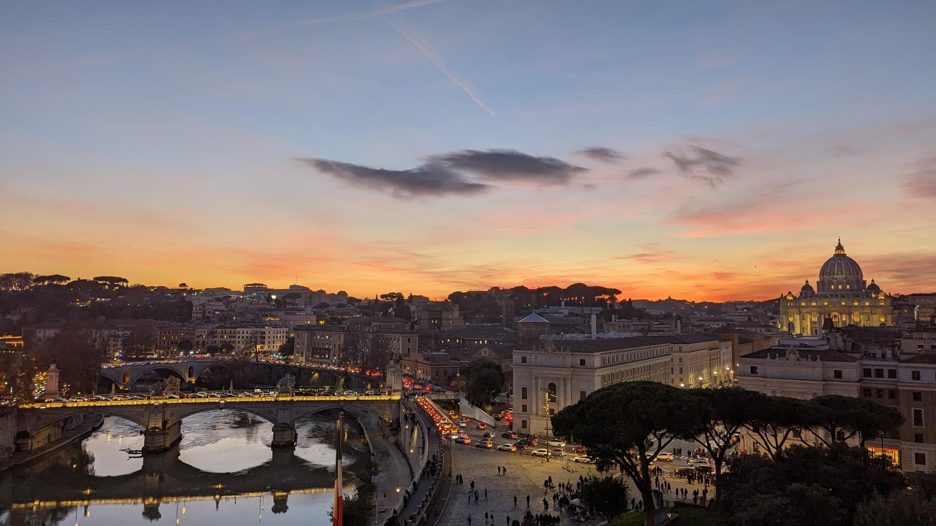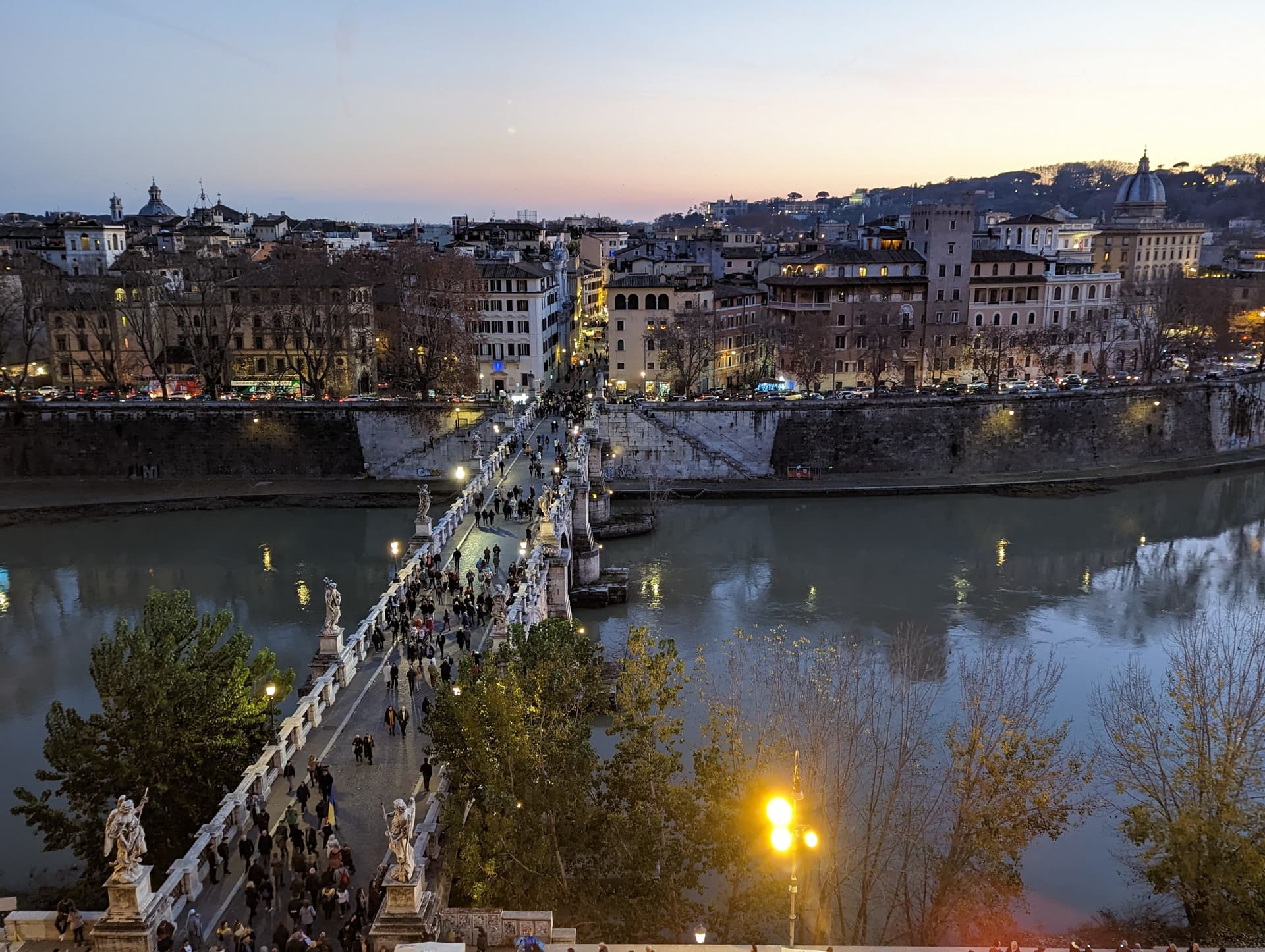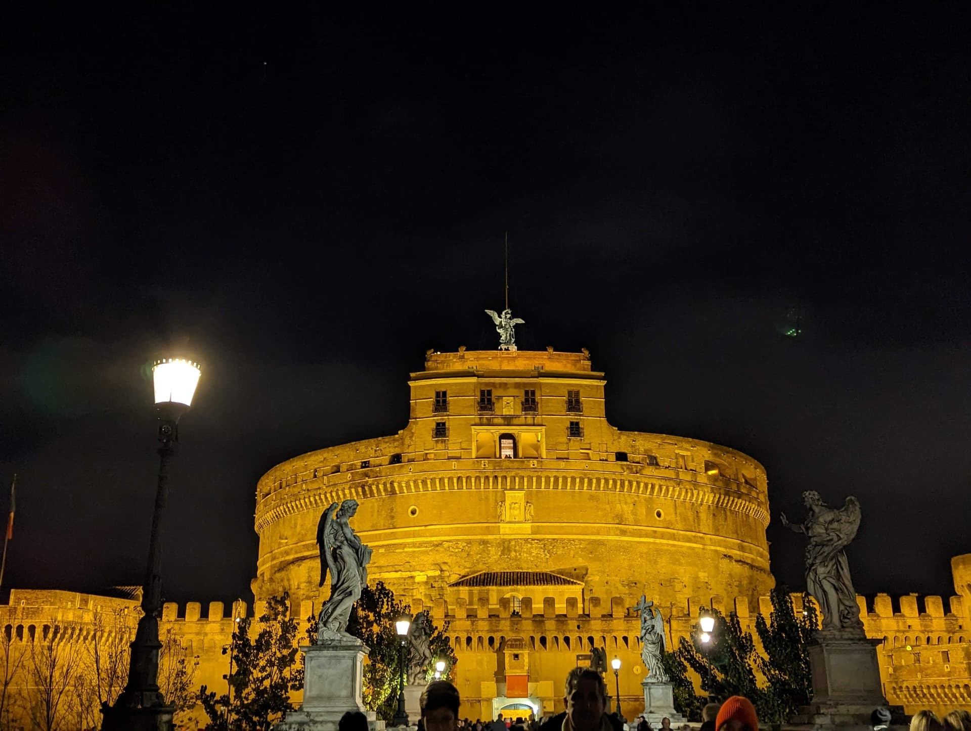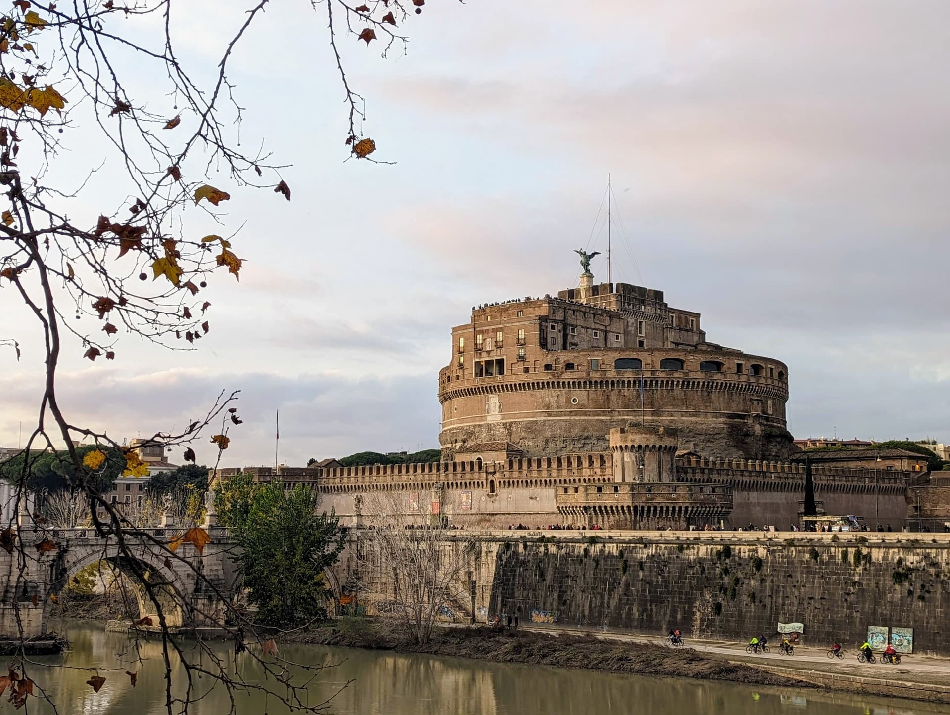 在日落前到了台伯河畔的圣天使城堡。这里最早是哈德良陵墓,后来改建为城堡,因教皇曾看到天使显灵而得名。
