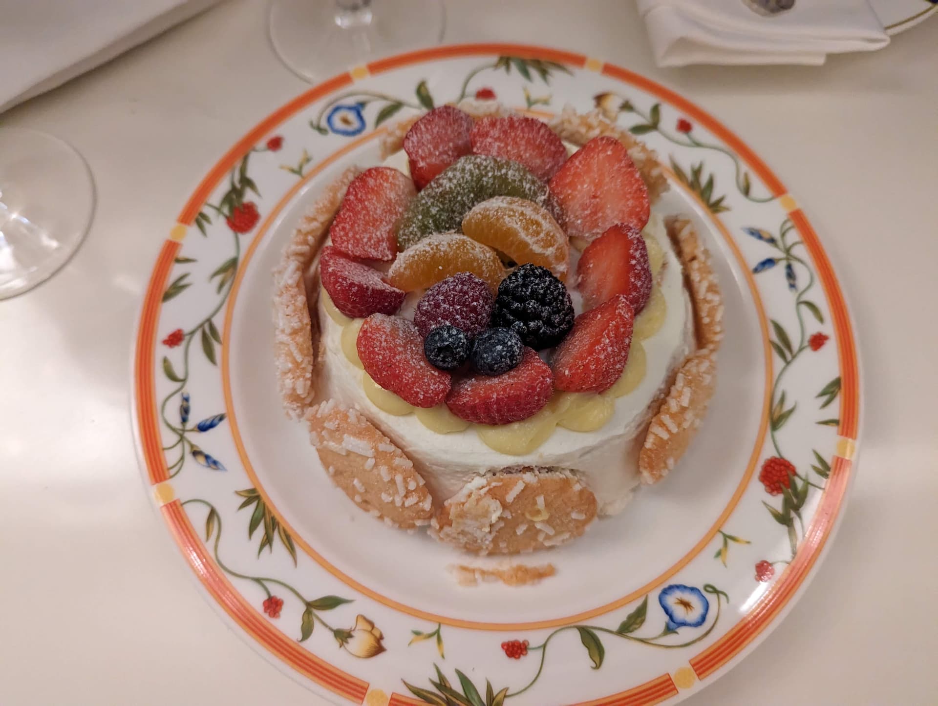 还送了香槟和蛋糕,乍一看围着一圈饼干很像夏洛特蛋糕,也许算Cassata?