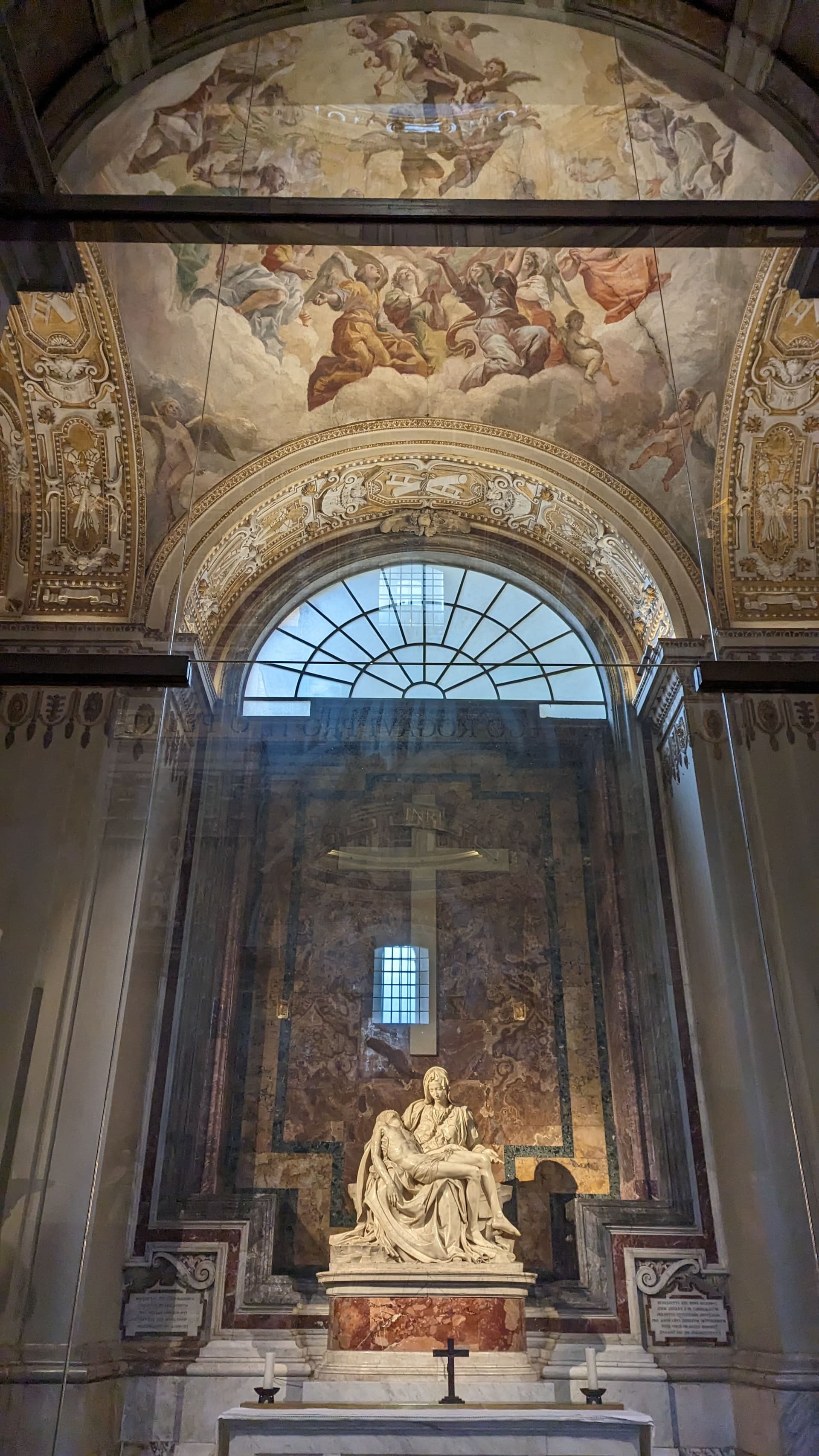 青年米开朗基罗所作的《圣母怜子像》,在1972年遭到破坏,现在加装了防弹玻璃。