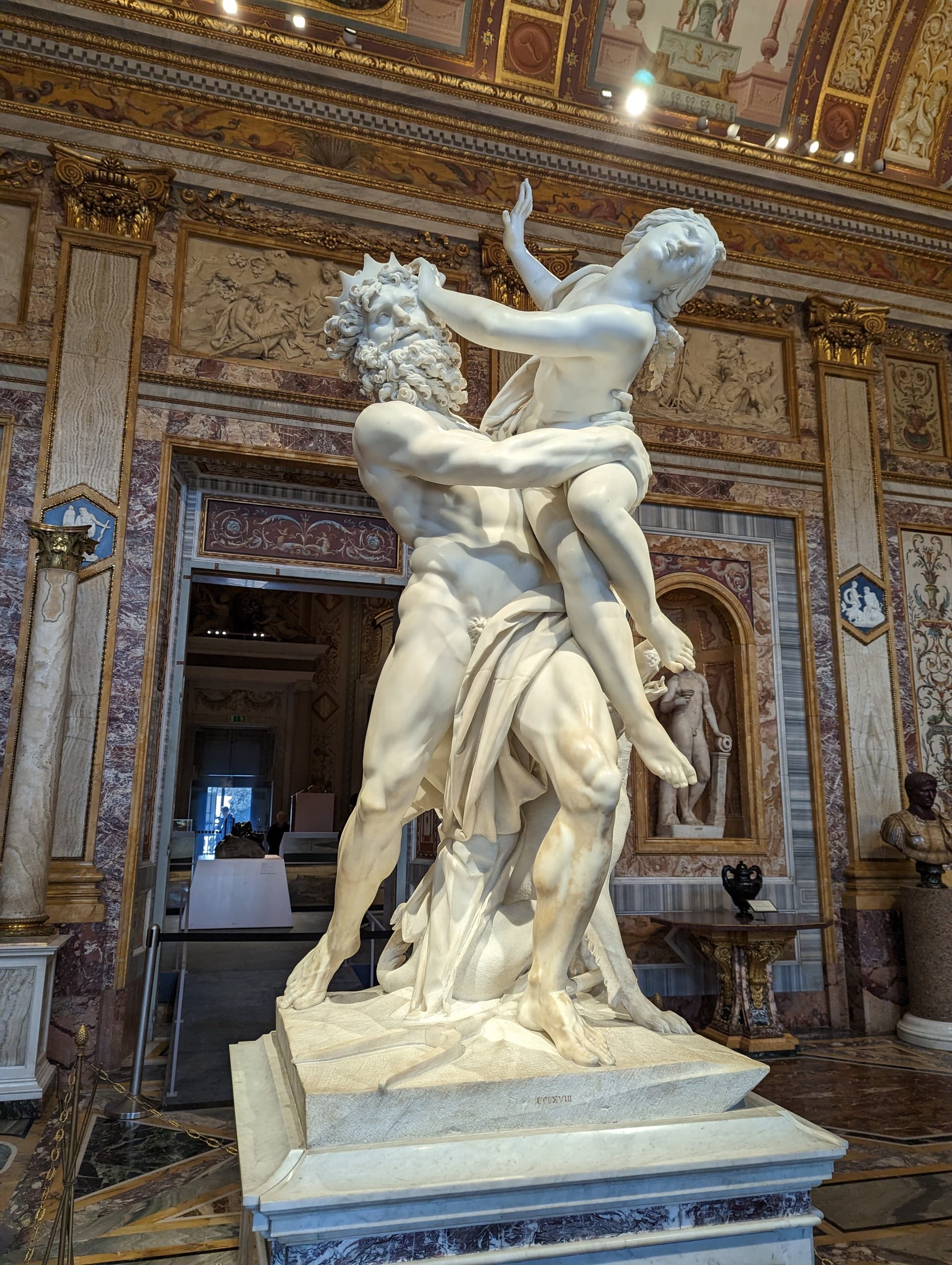 第二天一早去已经预约好的Borghese美术馆,Google map上却显示当天不开,非常迷惑,还好到了现场发现是正常开放的。这里收藏了很多贝尼尼的雕塑,以前看到过这尊《被劫持的普洛塞庇娜》的高清大图,远远不及亲眼所见来得震撼,肌肤的细节太逼真了。