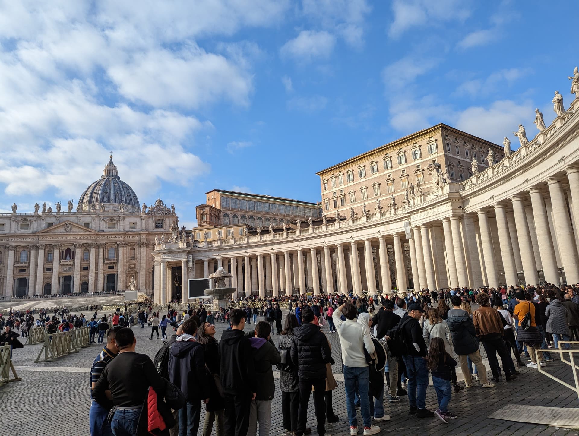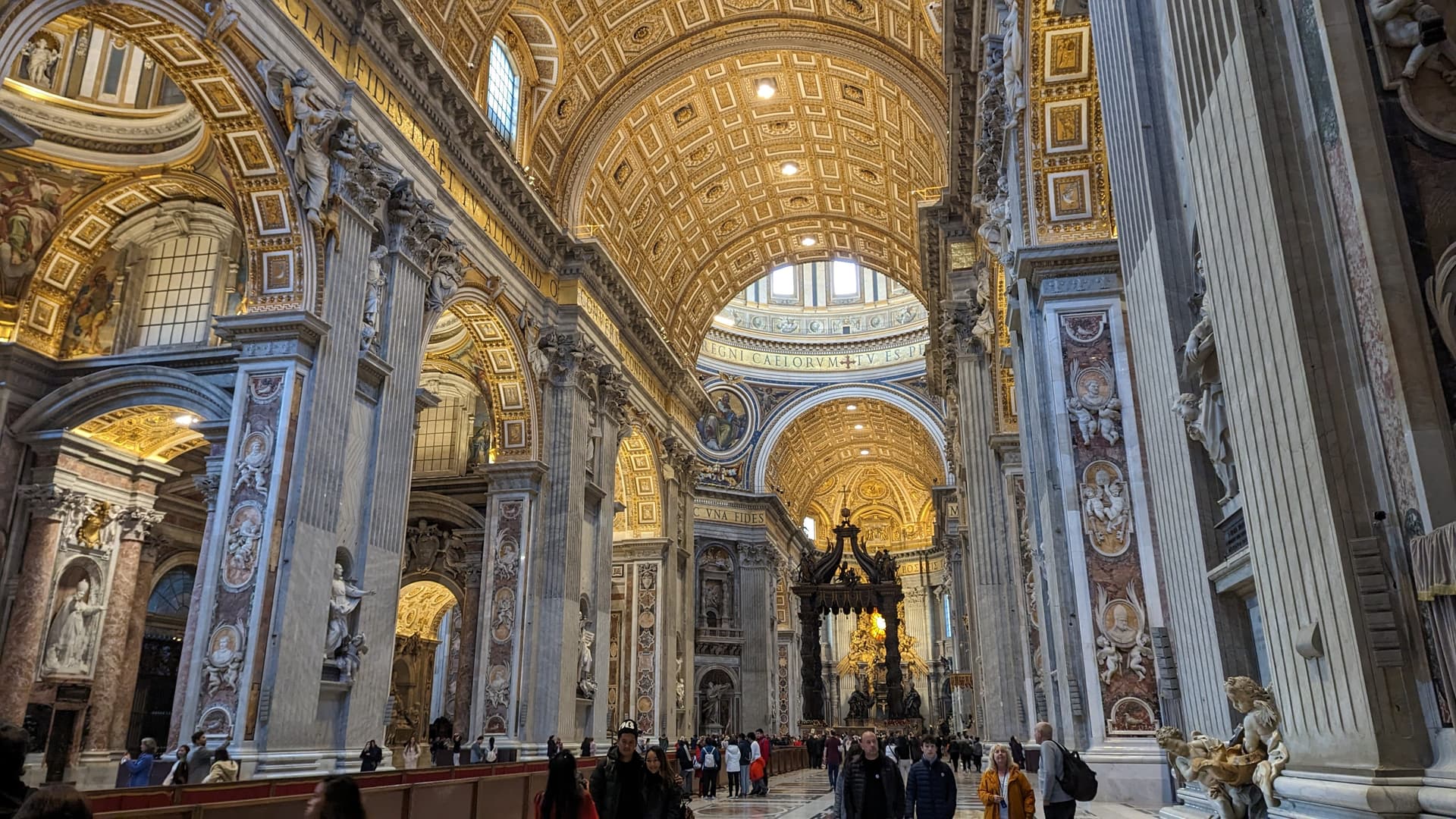 瞻仰完西斯廷小堂里的壁画出来,绕过出口的螺旋楼梯和门口长长的队伍,到圣彼得广场加入另一队长龙参观世界上最大的教堂。下午2点多开始排,实际等了40分钟上下。圣彼得大教堂本体免费参观,登顶需要买票,可以选择步行或坐电梯。步行8欧,不用等,比坐电梯便宜2欧。电梯票则是要排队坐电梯上去,再步行一段。