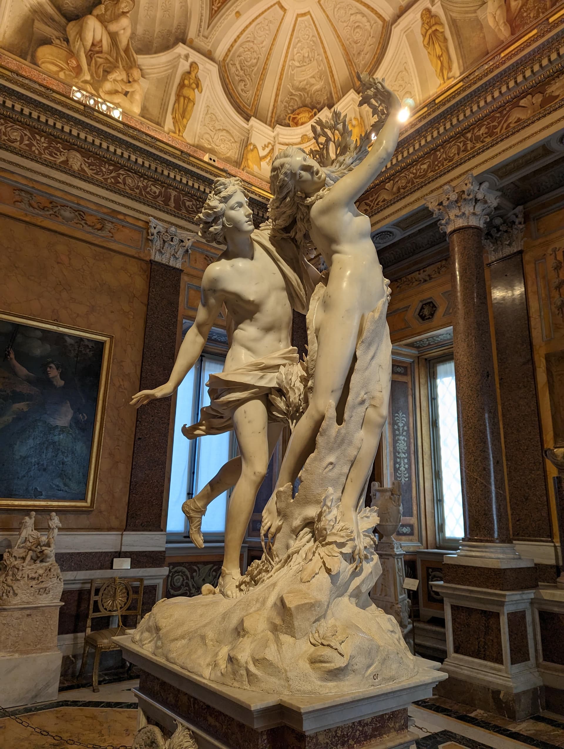 《阿波罗与达芙妮》也站着盯了很久,达芙妮想要逃离阿波罗的追逐,让河神父亲将自己变成了一棵月桂树,这座雕像就定格在变成树的瞬间。