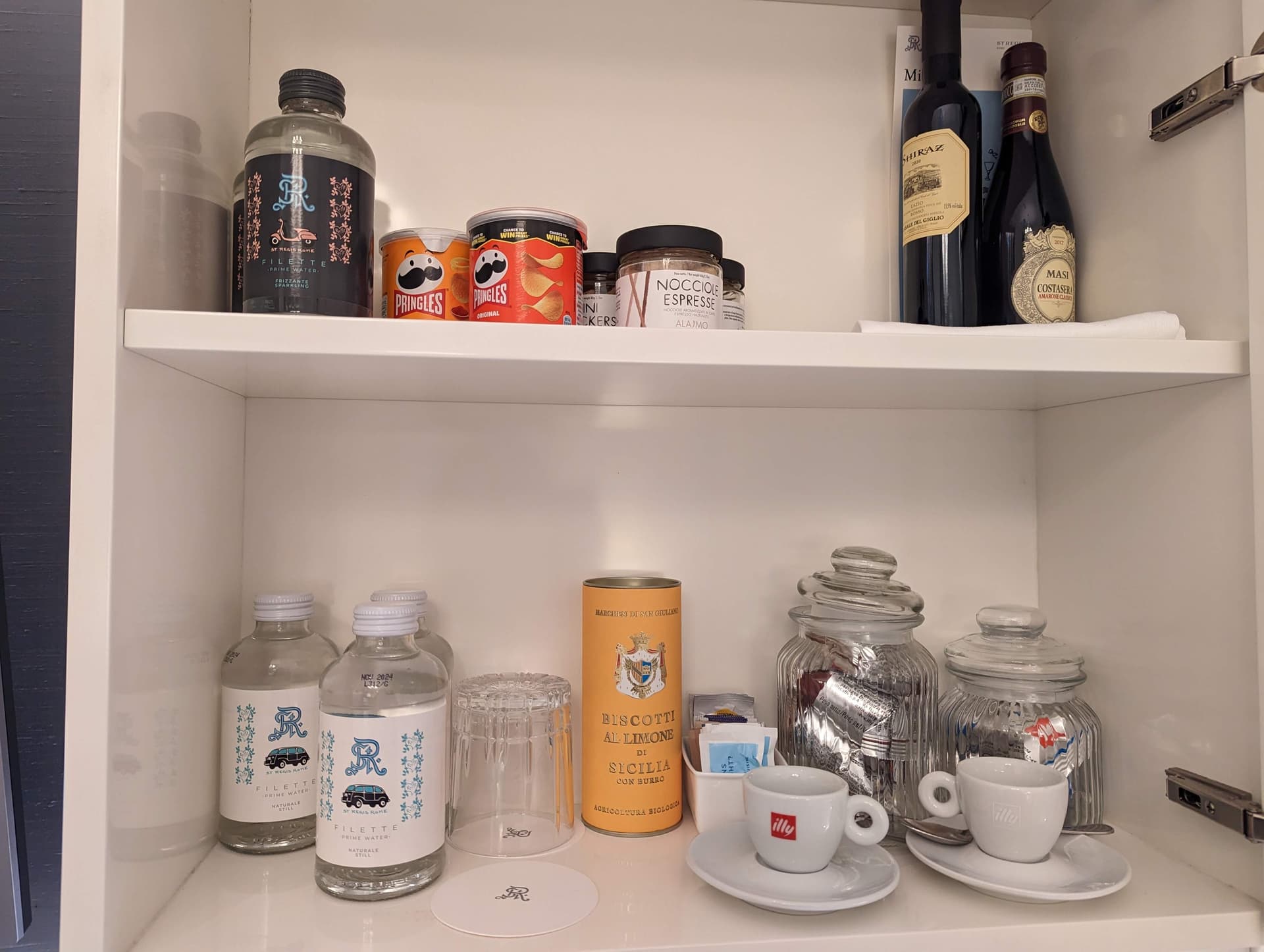 免费的瓶装水给得很慷慨,4瓶still water和2瓶sparkling water,夜床的时候还会再补充。咖啡机用的是本土的illy,之前两家都是nespresso。