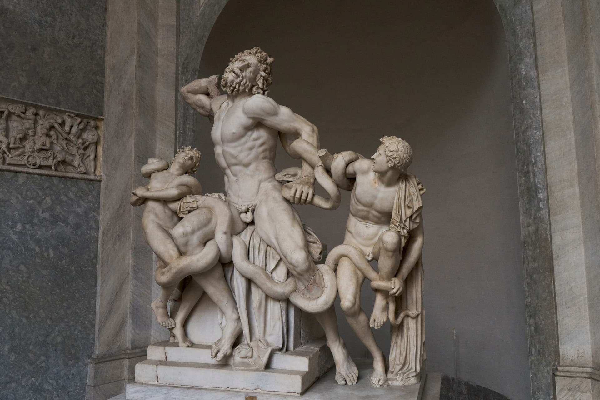 这座拉奥孔的雕塑是最知名的藏品之一,描绘希腊神话中拉奥孔因揭穿特洛伊木马触怒雅典娜,与儿子们被蛇绞死的景象。乌菲兹美术馆里有后人所作的复制品。