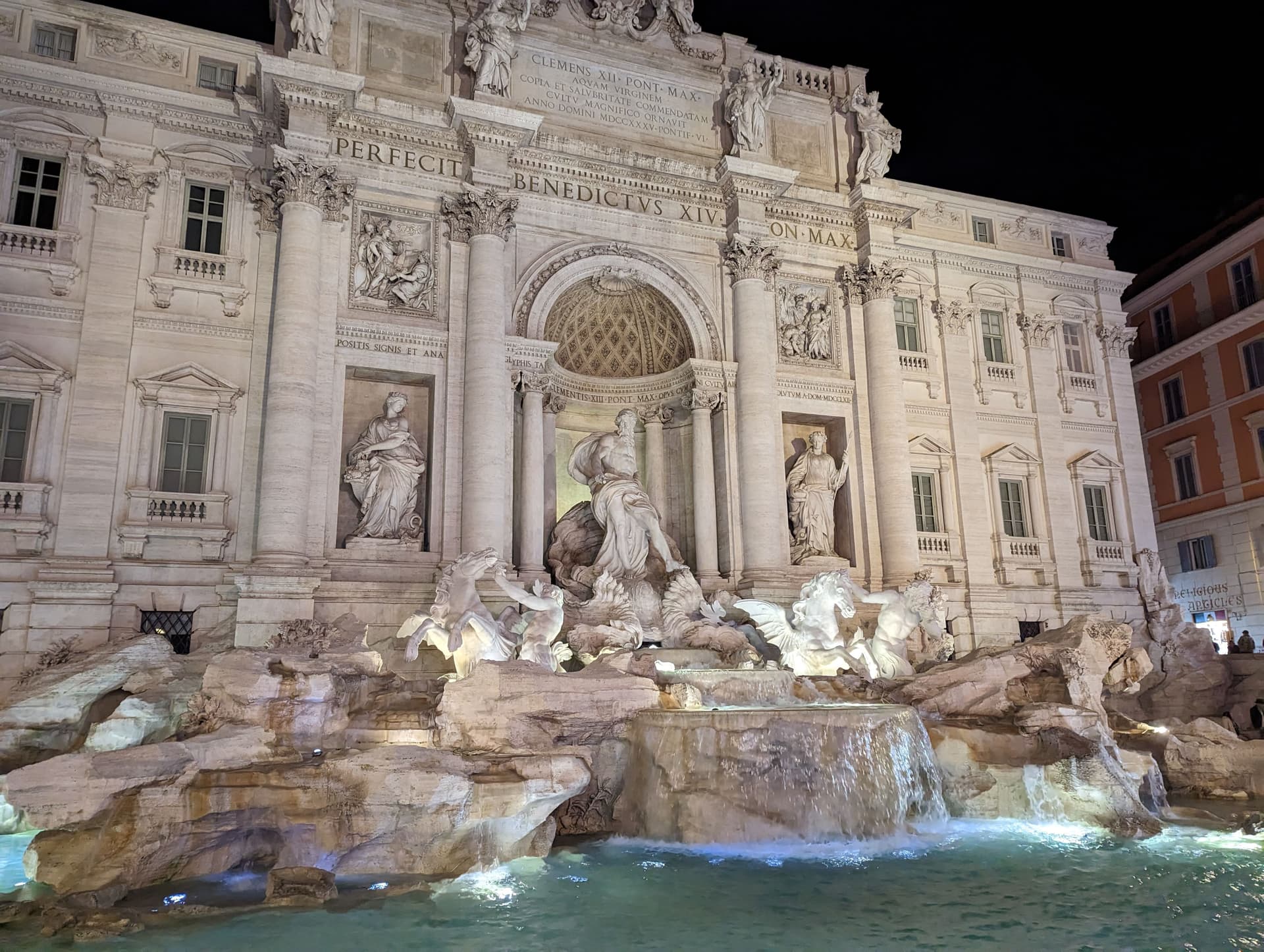 特莱维喷泉也是知名打卡地标,处女水道桥的终点。罗马城中分布着大大小小的喷泉,古罗马时期由输水道供水给各个喷泉供市民取水使用,现在很多喷泉经过现代化改造仍可使用,比如特莱维喷泉就装了抽水马达。从livecam 看这里从早到晚人都没有少过(其他景点也可以用这个先看看人多不多),大家对扔硬币也相当有热情。根据都市传说,扔一枚回到罗马,扔两枚在本地有艳遇,三枚踏入婚姻殿堂。至于池底的硬币,早些时候的新闻有说被用来救济穷人的,也有说经常被人偷走的。