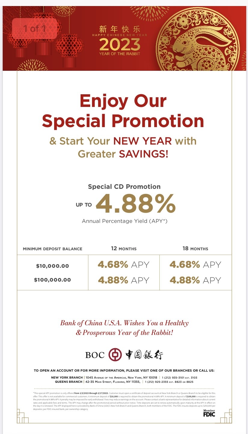 打扰大家一下,看到了个中国银行美国分行的理财活动,高达4.88APY,想问问大家这个靠谱吗?保本保息吗?就是我存10万美元,一年后能获得4880?是这样吗?