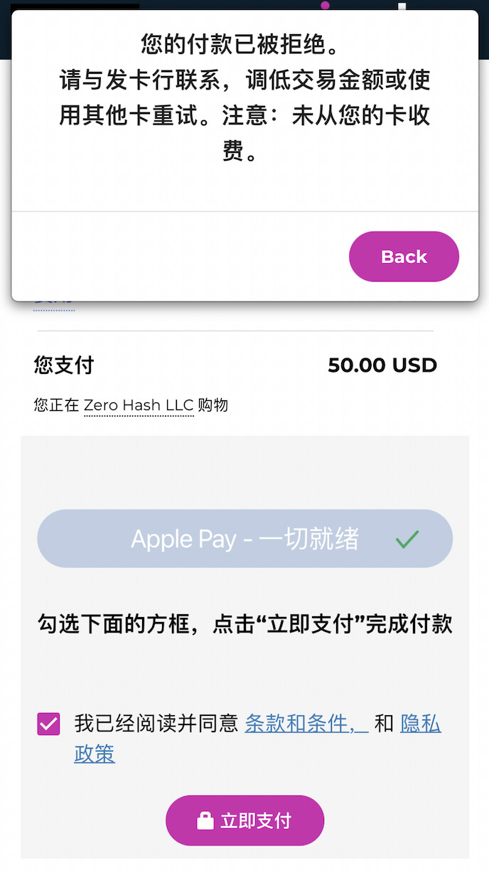 楼主在尝试走JAXX之类的钱包,用VISA/Mastercard买Crypto。USD/USDT。测试了VISA/Master,ApplePay都失败了。ApplePay提示银行拒绝交易。VISA/Master支付的时候好像也是一样的情况。测试MGC同样失败。他们的交易的代理是Simplex。