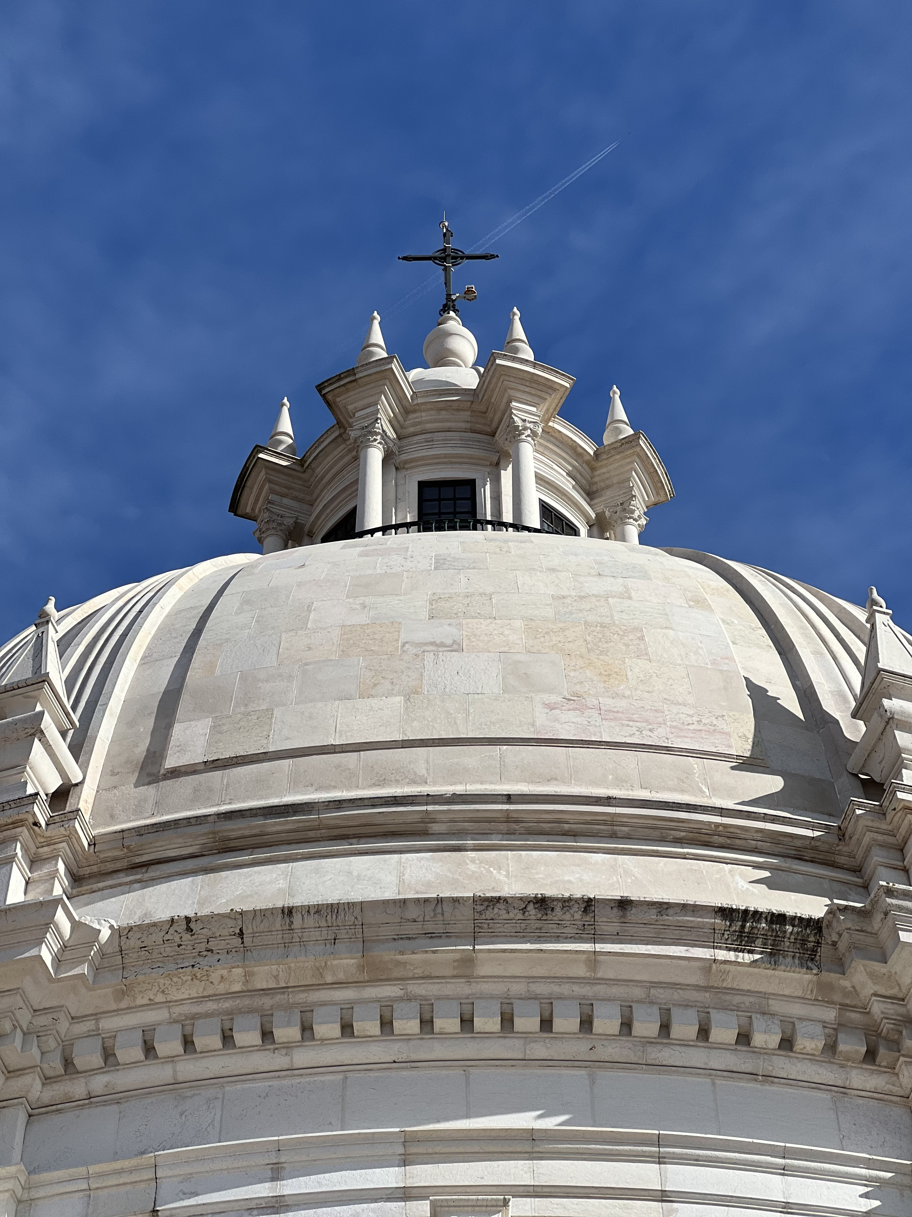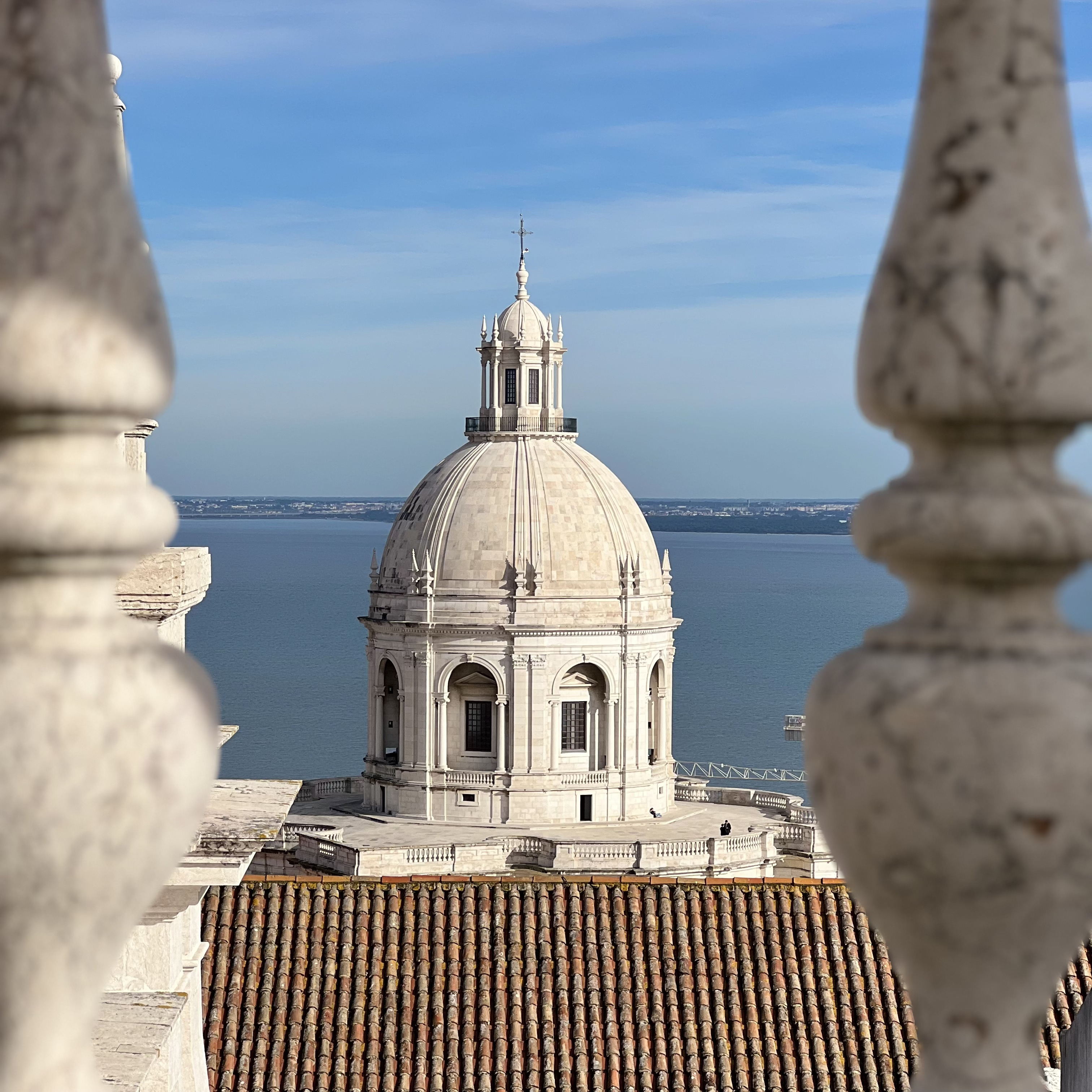 然后继续往前走啊走,发现这一块好像是里斯本的一个学校区,旁边有个艺术学校啥的,然后来到了一个只收现金的教堂【sao Vicente】,里面讲了一些葡萄牙的历史啊啥的,大航海时代我们多牛逼啊,我们用多么残忍的水牢对不同信仰的异端之类的,里面还有一些展品。最后走一个长长的楼梯就会到这个教堂的房顶?这里的风景非常好!外面就是一个海湾?还能看到大部分里斯本城区的景色,小风吹着也舒服,海鸟还会时不时从你眼前飞过。但是看久了也还是挺无聊的![]()