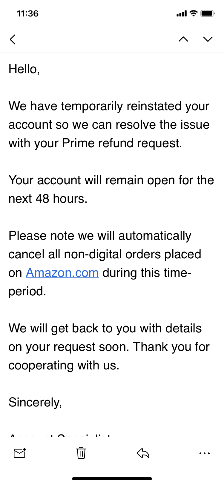 在提到帮我取消prime membership 之后,Amazon暂时恢复了我的账户,给我48小时的时间cancel membership。