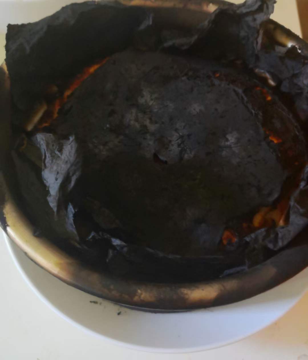 我也做出过类似的,估计是烘焙纸碰到金属烧起来了,但里面味道正常