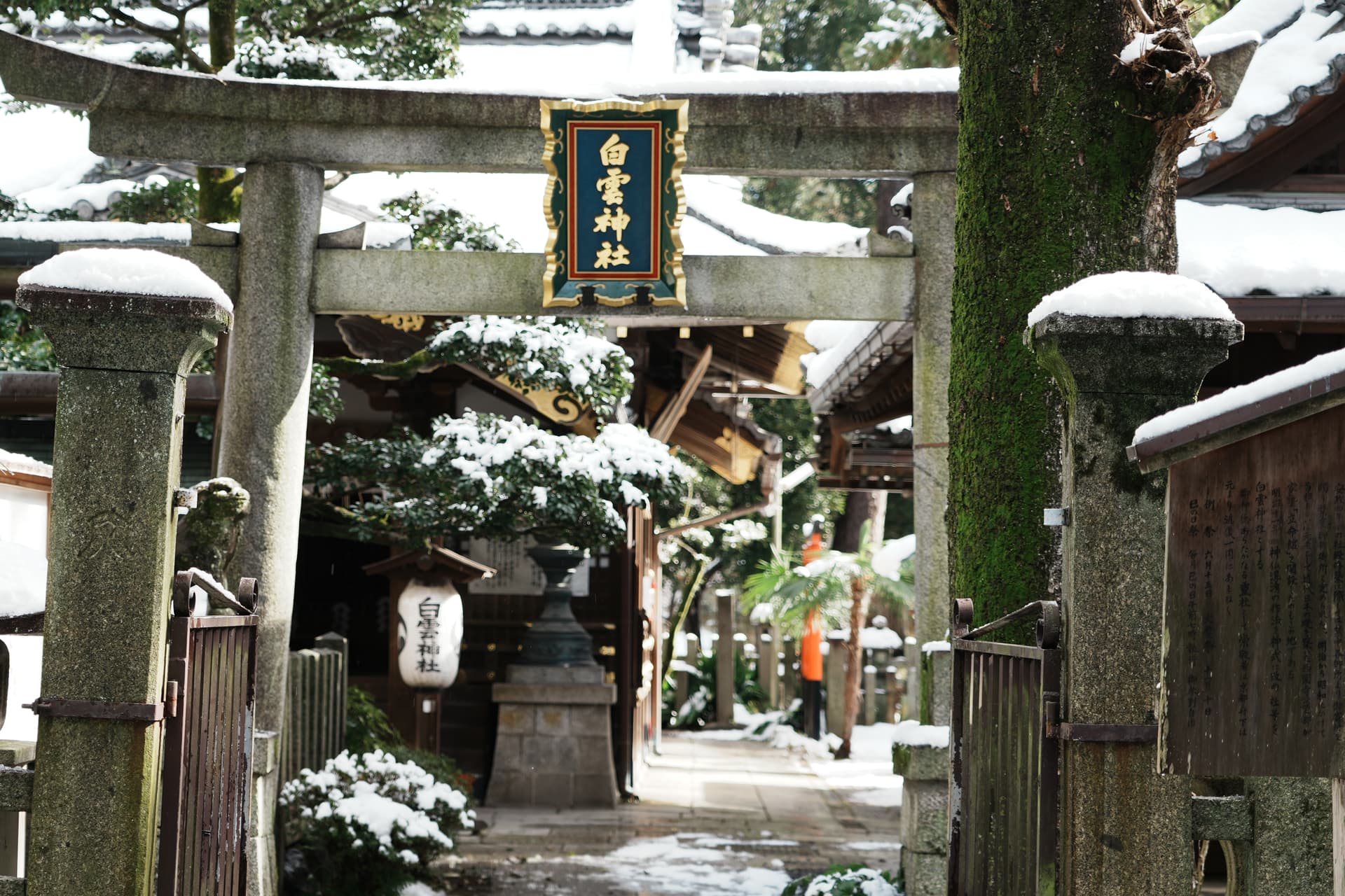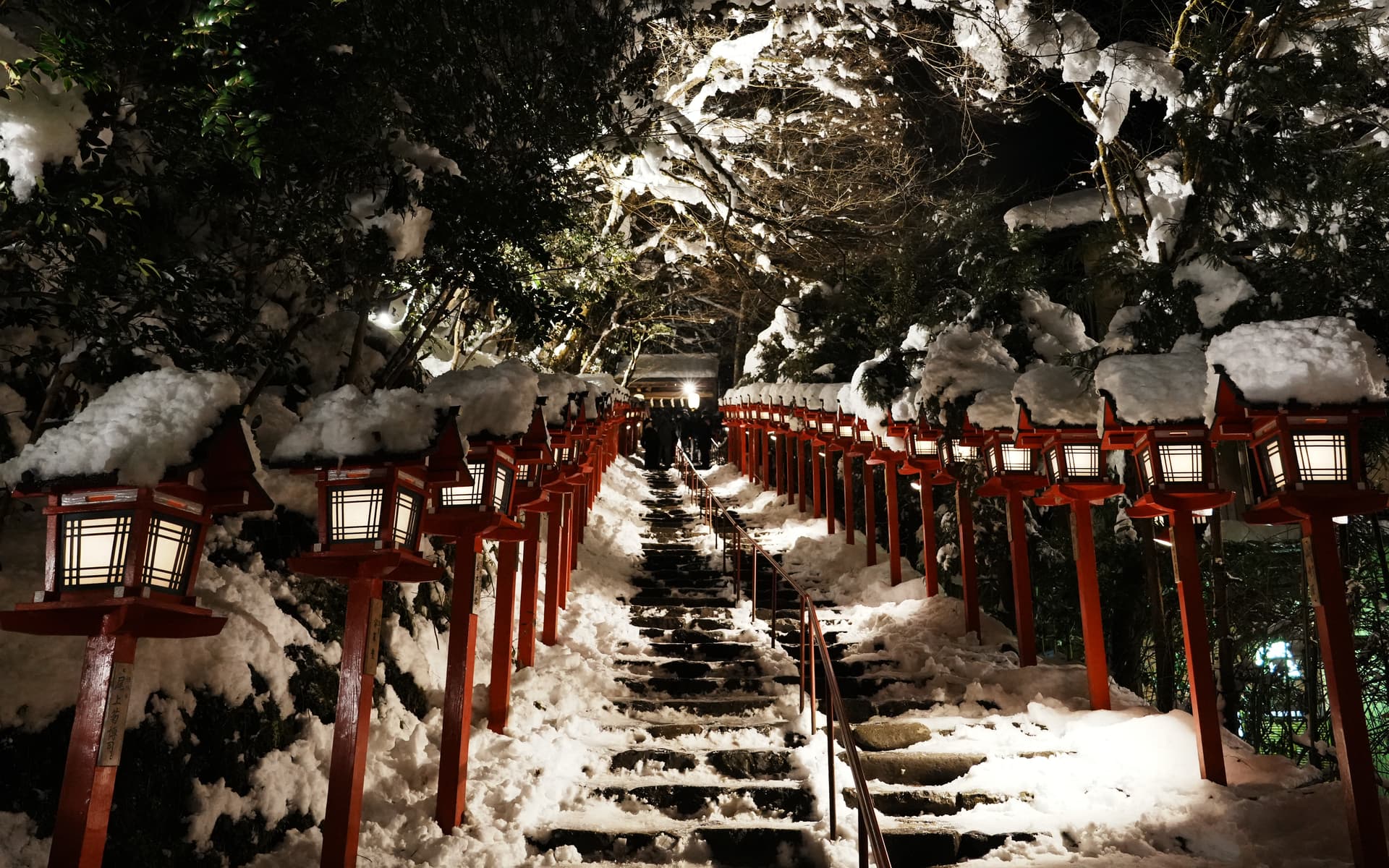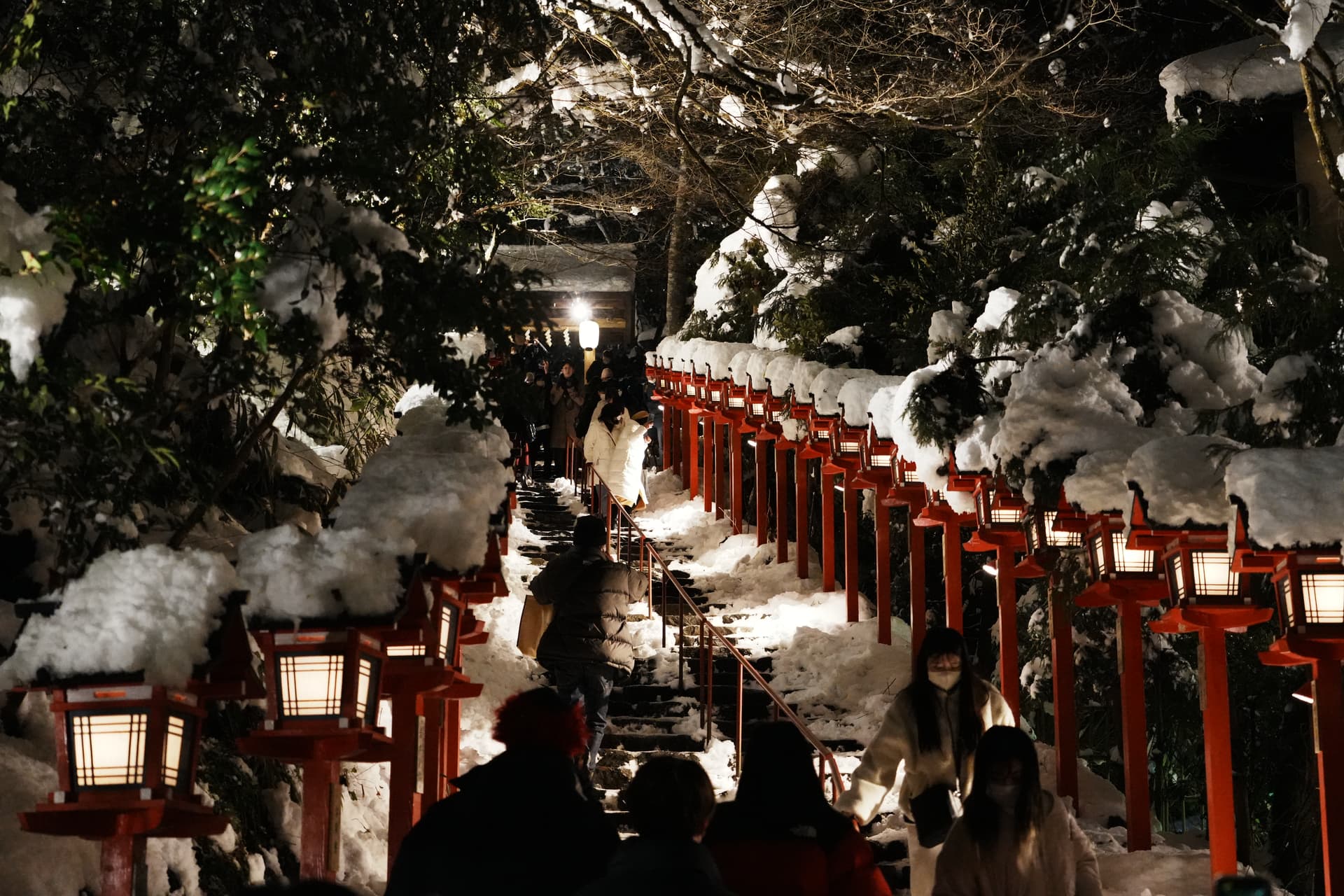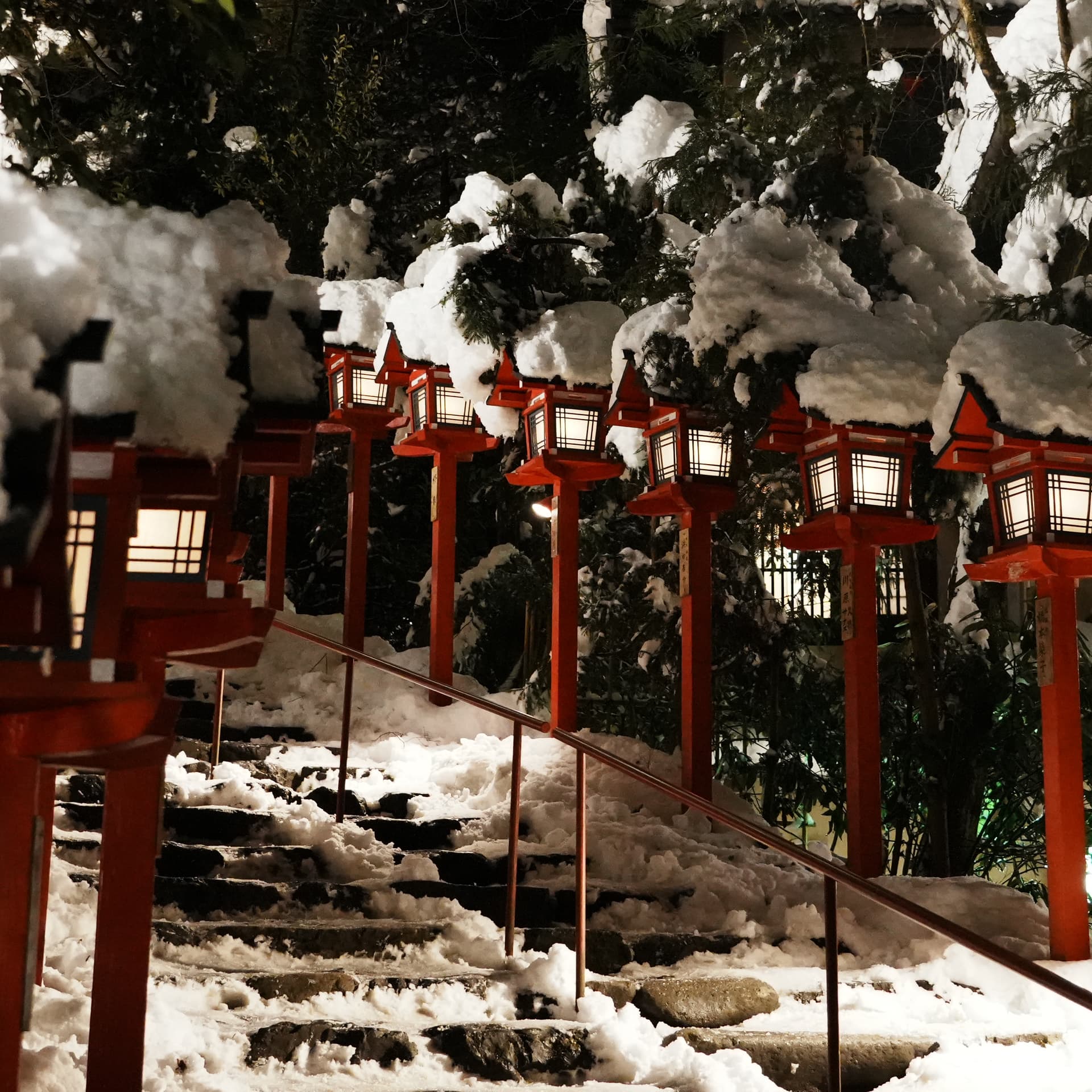 听闻日本出现了十年罕见的寒潮,然后前一天我们新干线经过京都的时候京都还在下大雪,我就感觉可能真给我赶上了,赶紧打开神社的推特确认(每天下午3:00宣布晚上会不会亮灯),果然当晚有点灯仪式。遂放弃了本来在酒店躺着倒时差的计划,直接出发。