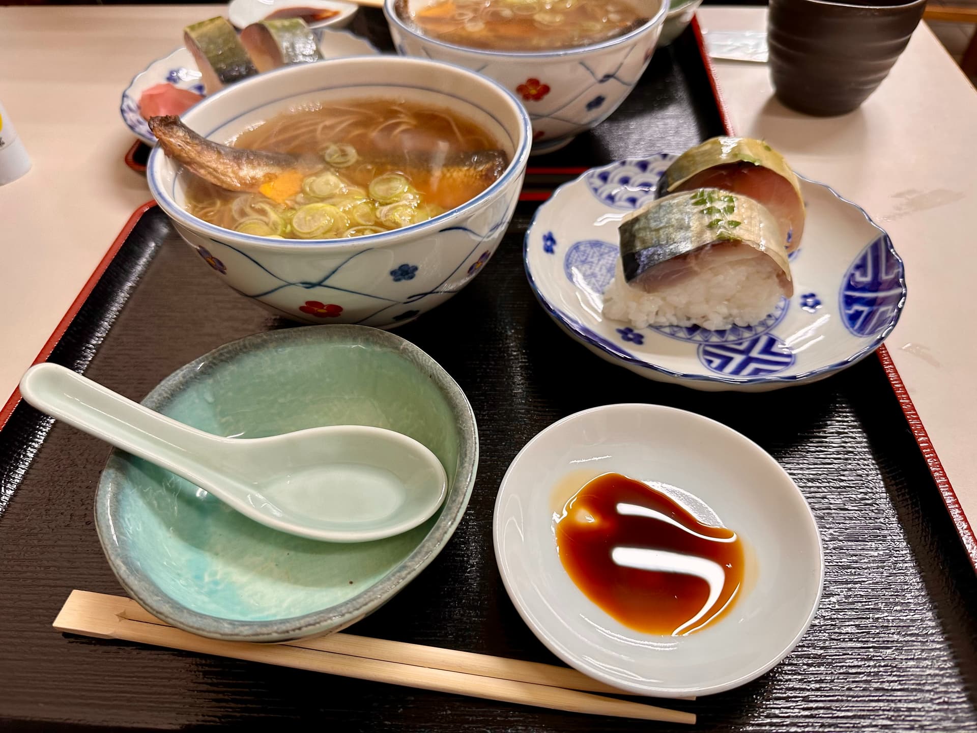 这里同时也是是鯖街道(古时从沿海运鱼进京都的商道)的终点。当时因为还没有冷藏技术,为了长时间储存鱼不腐坏,就诞生了にしんそば(鰊蕎麦)和鯖寿司两道京都特色。前头那个是甜口的腌鱼,后头是盐渍的鲭鱼放在寿司饭上。*注: 鰊蕎麦北海道也有。