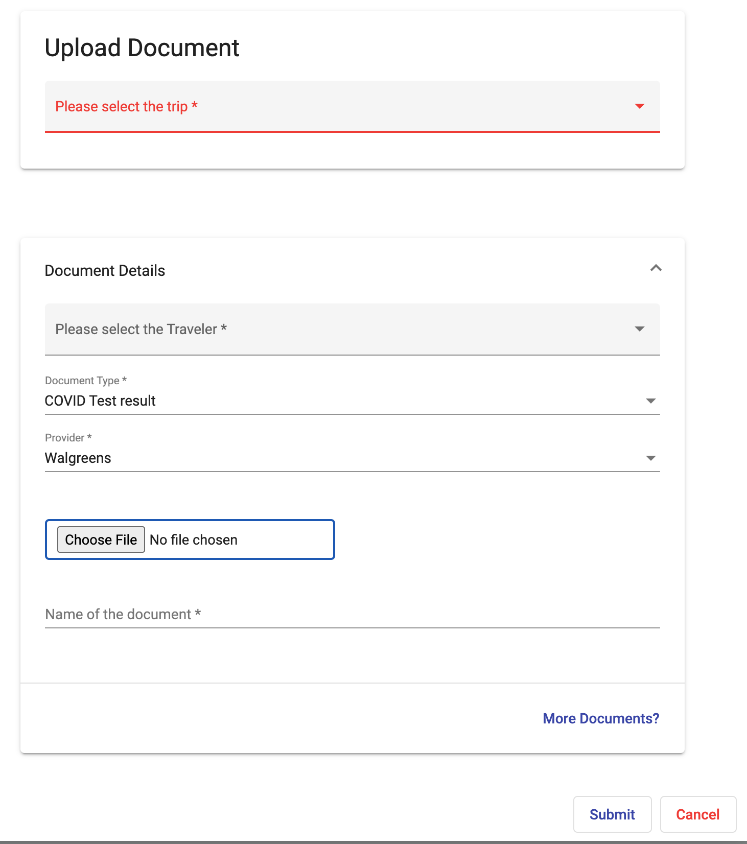 收到结果后回到Safe Travels平台 ,选择上传documents,选择trip、traveler、文件类型和检测机构即可。