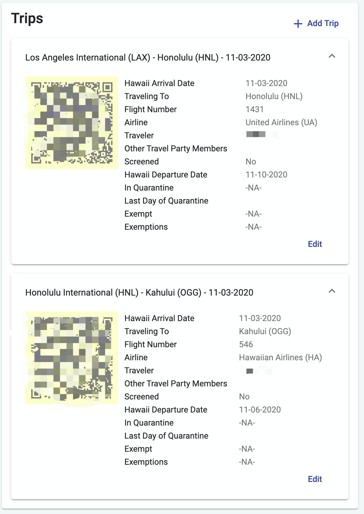 Your QR code readily available on your mobile device or printed out on paper.You may access the QR code on your device from your Trips Details at https://travel.hawaii.gov/#/trips/ .