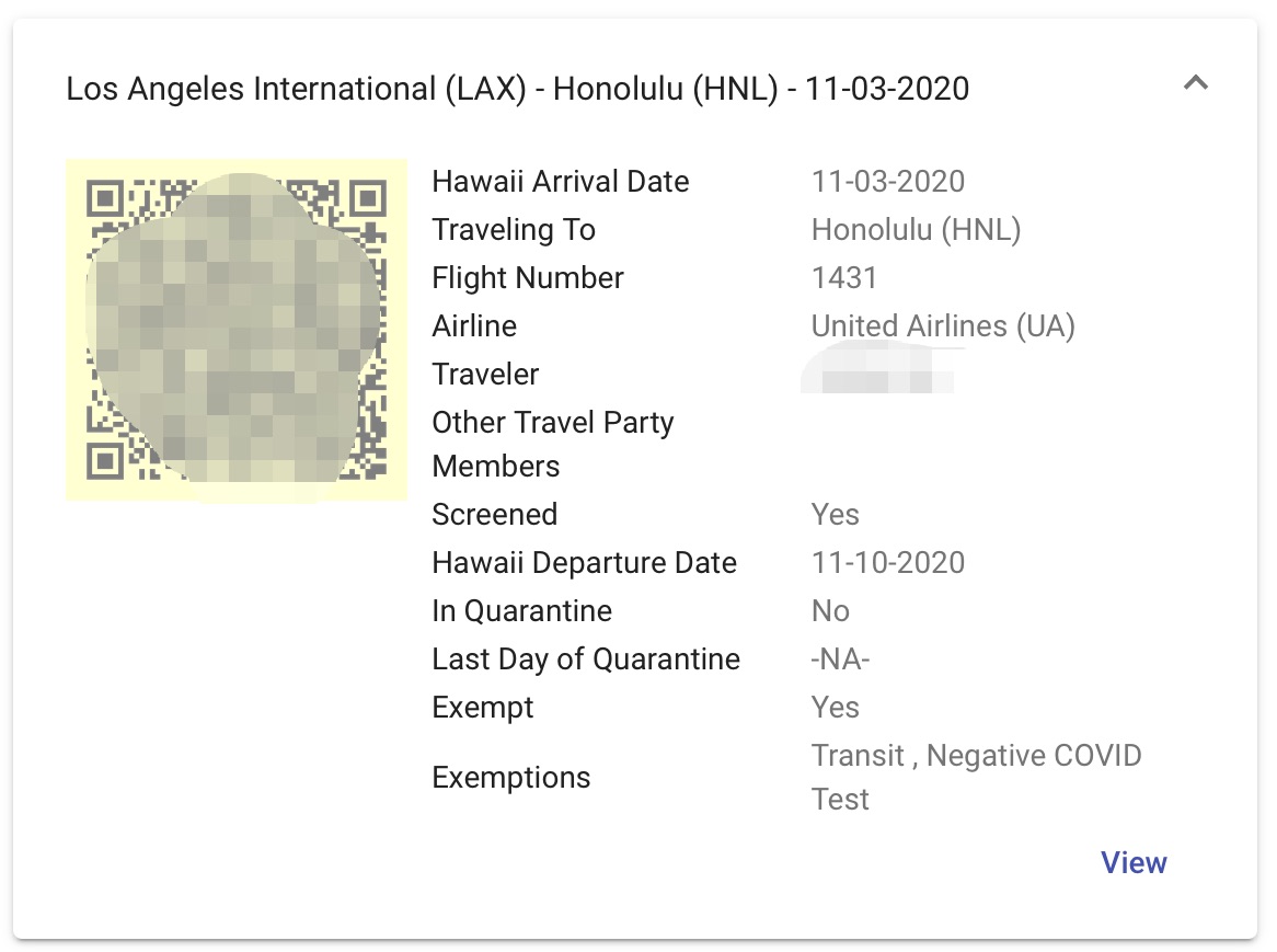 轮到你以后,拿出事先准备好的二维码,扫码以后工作人员会确认你是转机还是去Honolulu市区,住的酒店等细节。如果跟我一样是转机的,需要出示booking reservation或者boarding pass,确定是当天离开的飞机。这些都验证之后,工作人员会在系统上给你标注为screened,In Quarantine状态也会更新成No。记得要截图这个界面,接下来入住酒店、租车什么的都要验证你是核酸阴性且无需隔离。